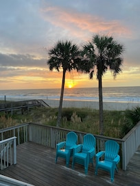 Distinctive ocean front home with pool, elevator to all floors, and private beach. Five bedrooms with two queen size beds in each and one master king with jacuzzi. Elegant décor with themed rooms reflecting the owners' international travels. Two glassed sun porches, balcony, sundeck, and veranda with rockers. Downstairs bar with grill, and hammock. Expansive paved parking. A home designed for comfort and elegance.