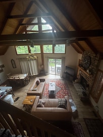 This beautiful chalet lets you get right to the business of relaxing. Cathedral ceilings and lots of windows combine to give the main level a bright and airy feel. Delight in the perfection of sitting by the stone fireplace and gazing out at the woodland scenery surrounding you. Watch your favorite show on TV in the great room or take a little quiet time to snuggle up on the sofa with a good book.