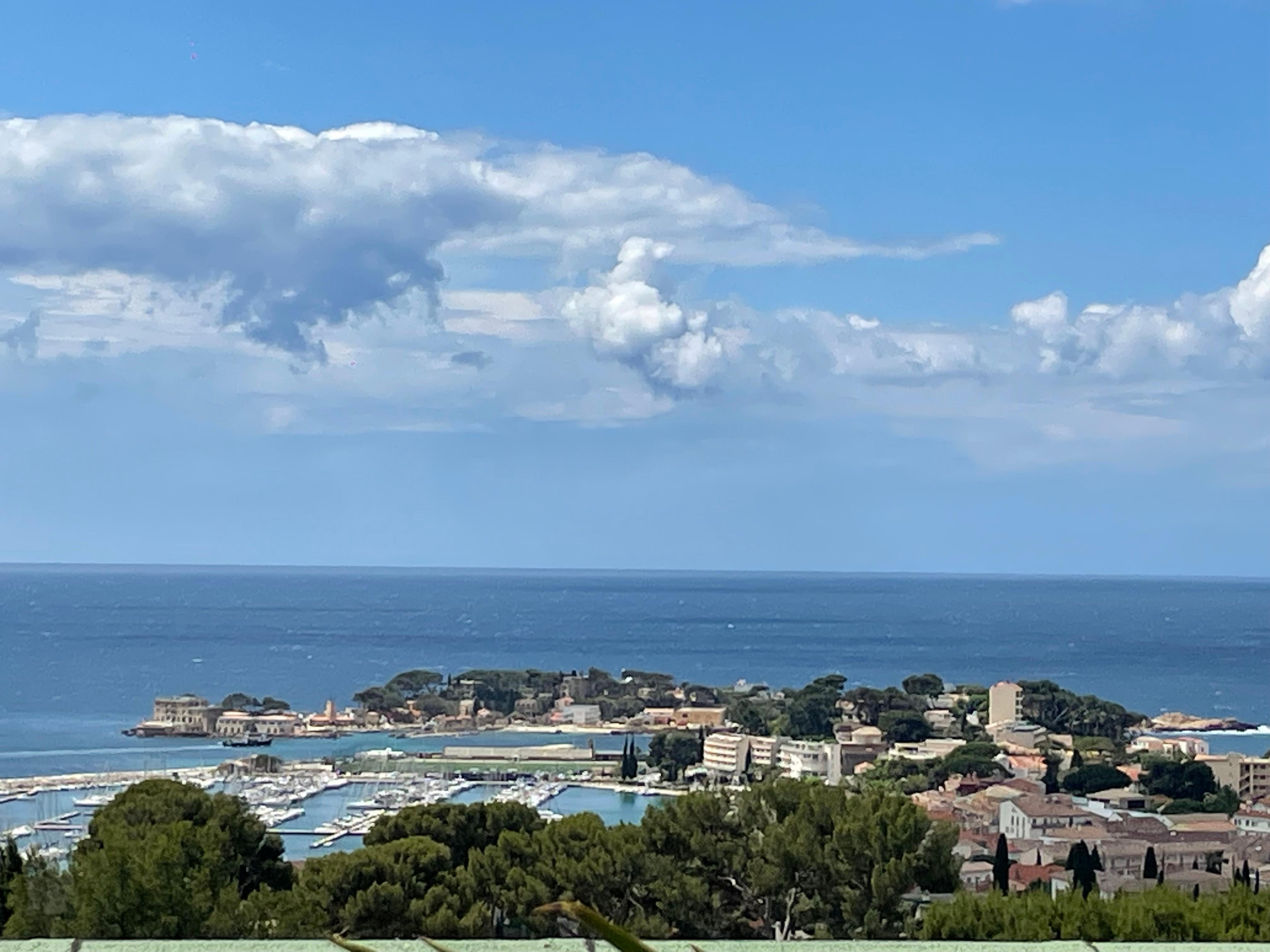 air-conditioned living room with sitting area, dining room and equipped kitchen (dishwasher, washing machine, induction hob, oven, fridge and freezer ...) large picture window giving access to the terrace, with an exceptional view of the bay of Bandol.