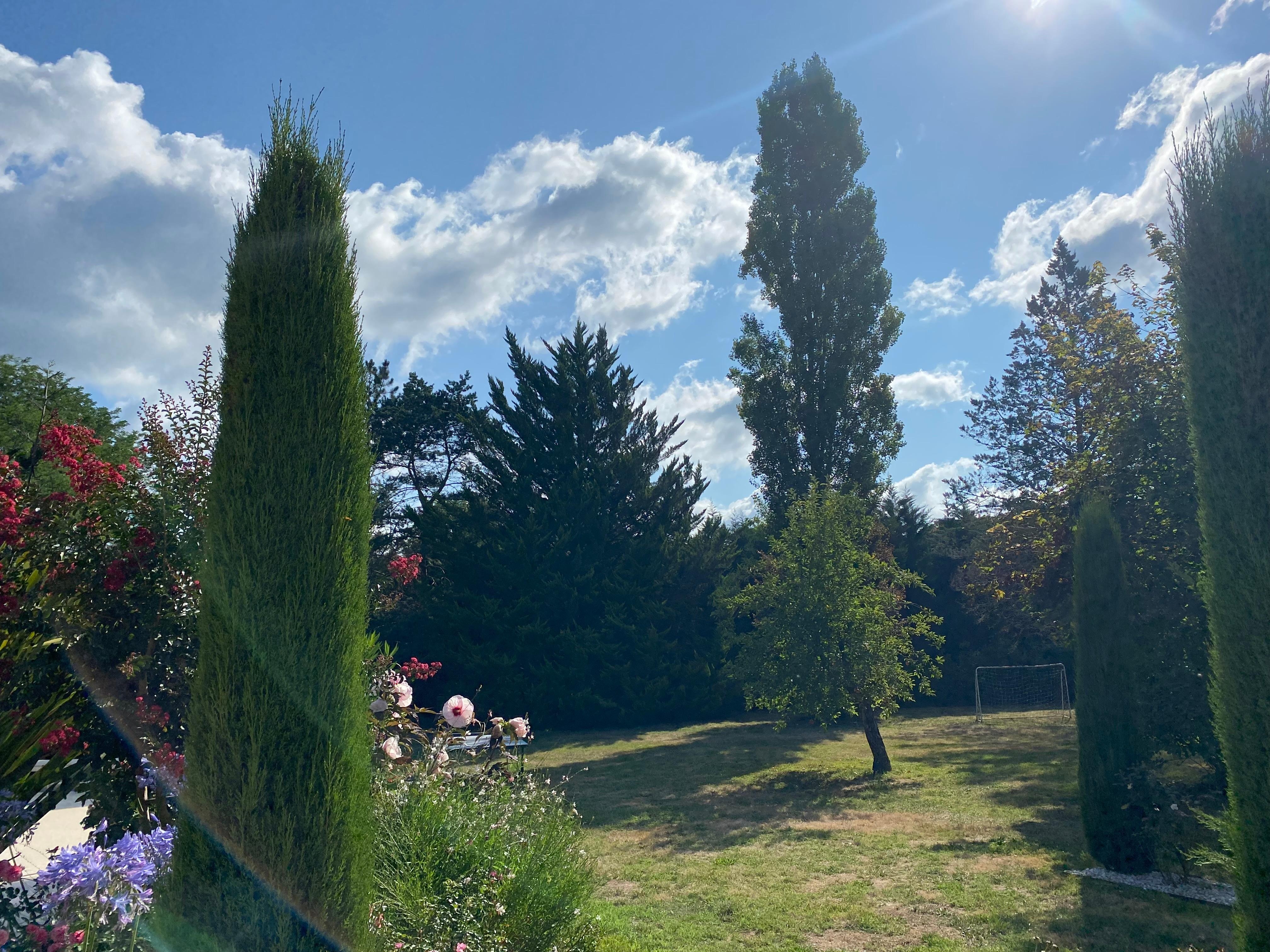 * a spacious and light filled modern kitchen with large double aspect windows overlooking the garden. The kitchen offers all the necessary equipment for preparing home cooked meals (electric oven, gas hob, fridge freezer, dishwasher, washing machine/dryer, coffee machine, kettle, toaster...). Thanks to the solid wooden dining table and 6 chairs, the exposed beams, and the woodburner, it is an ideal spot for convivial dining.