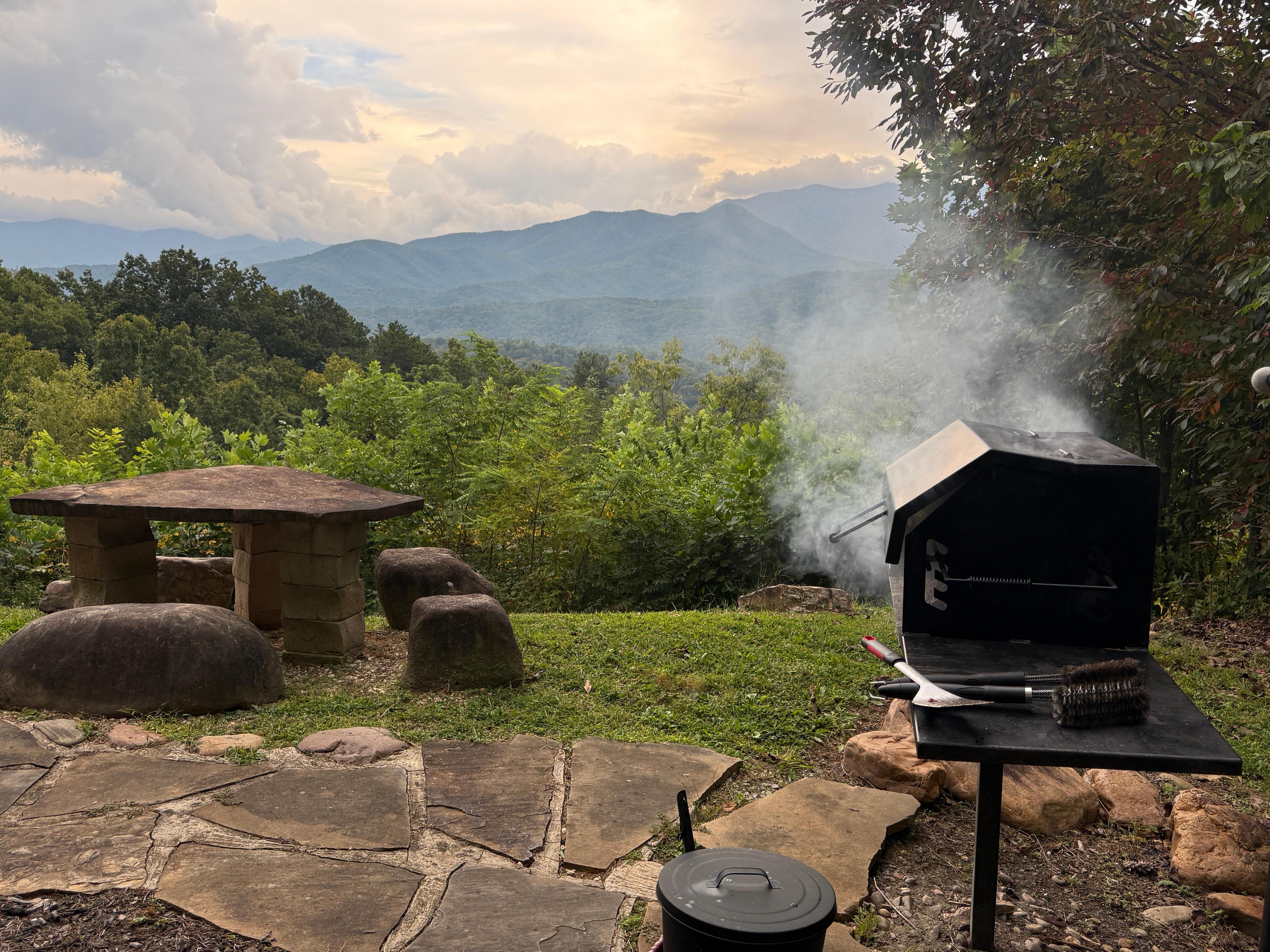 For the BBQ masters step outside & find a welcoming flagstone patio LIGHTED grilling area with a clever stone & boulder picnic table & BBQ GRILL~enjoy your meal on one of two picnic tables with superb views of the Smokys!