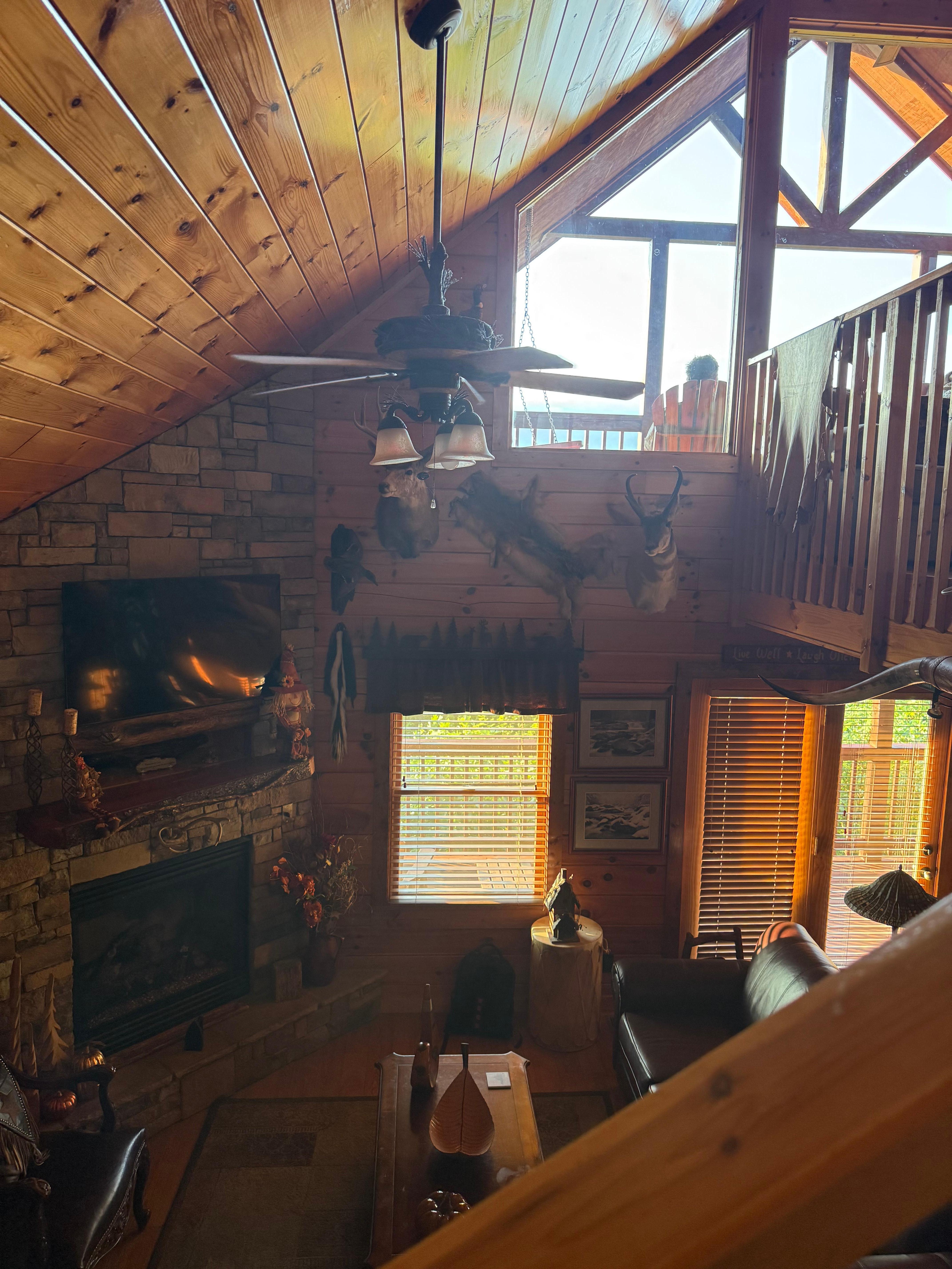 Our cabin is meticulously maintained, as the reviews will attest. An Exquisite Rustic Décor rarely provided in other cabins. Luxe details such as tree carved front door, numerous antiques, original local artwork, upscale & hand carved furniture, 3 stack stone fireplaces, real log walls with exposed beams throughout the entire cabin, beautiful pinecone & cardinal stain glass windows~just to name a few. When creating our home we kept your comfort in mind~from plush pillow top beds & comfortable recliners, cozy throws to curl up with & several extra details~easy remotes, full length mirrors, accent lighting~all is our goal to pamper you with every extra detail & touch. This is a one of a kind, unforgettable experience to treat yourself, unwind & indulge in real MOUNTAIN LUXURY!