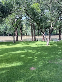Majestic giant oak trees surround the house and envelop the property with beauty and privacy. Walk onto the large, well-shaded deck overlooking a spectacular view of huge cypress trees, an expansive yard containing an immaculate lawn, wildlife, and striking limestone cliffs lining the riverbanks. The backyard stretches across 170 plus feet of river frontage inviting swimming, tubing, fishing, boating or cooking your favorites on the gas grill. Enjoy and relax on the newly built bulkhead with wide steps making easy access into and out of the river.