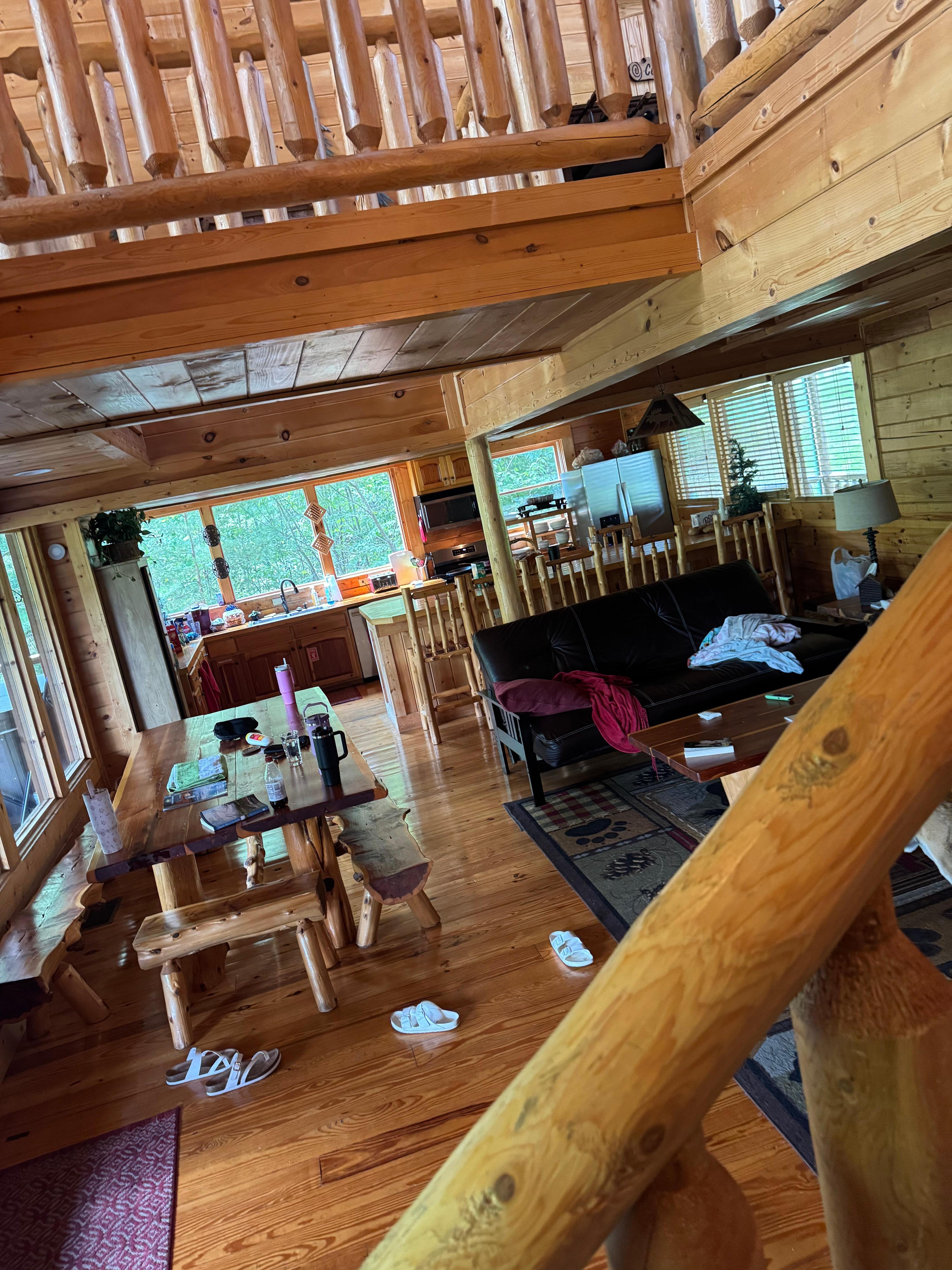 When you enter this magical cabin, you'll immediately notice the glass windows everywhere, even on the corners of the cabin, inviting you to bring the outdoors in. Suspended high off the ground, the back of the cabin gives you beautiful hillside and tree vistas. Beautiful large kitchen, huge custom live edge dining table, accommodates up to 10 and several bar stools gives you seating for 16 total. There is an outdoor community pool usually open from the end of May to the end of September, weather permitting.