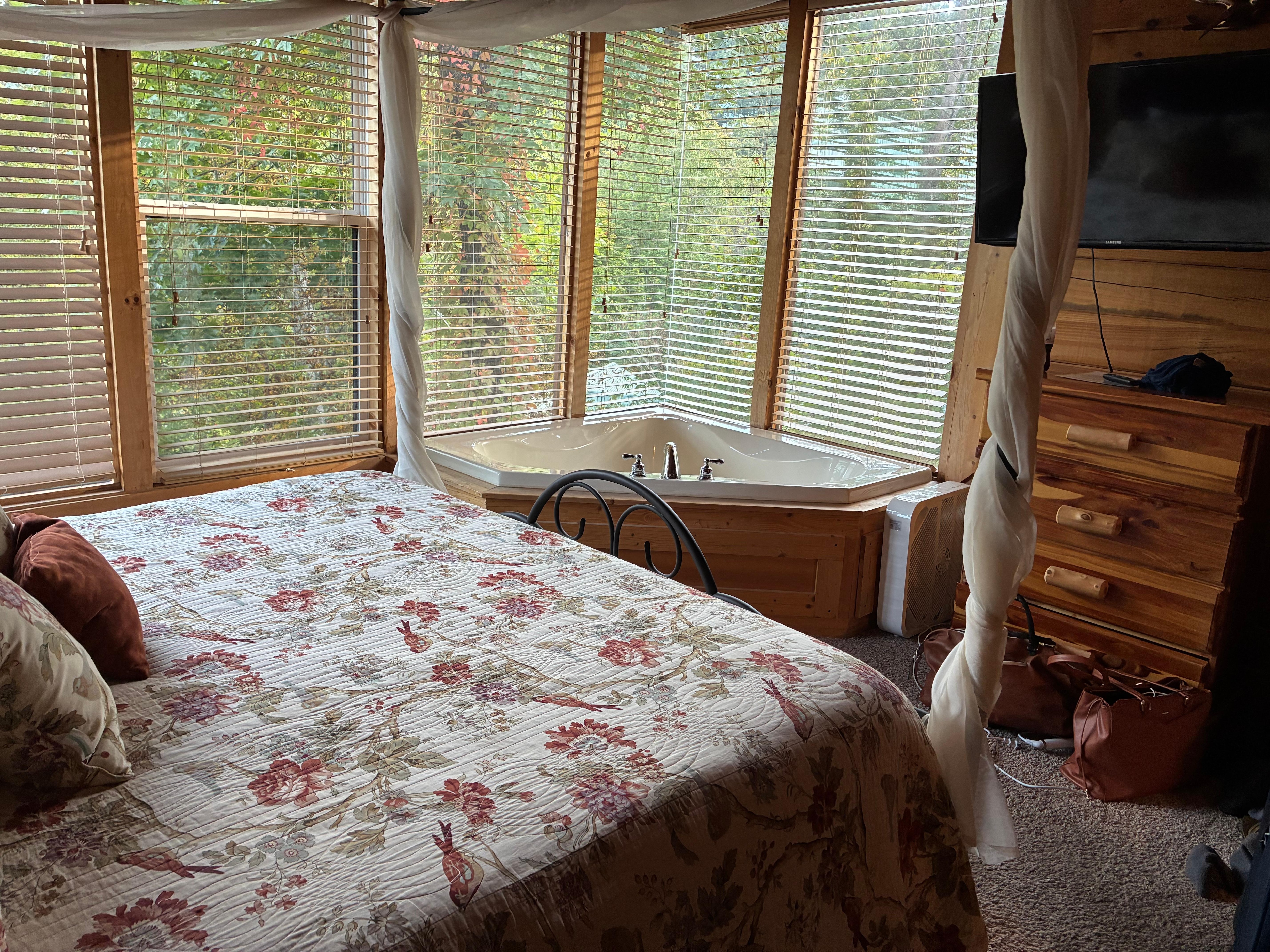 PAPA BEAR ROOM: Features a vaulted ceiling, mountain and tree views, king canopy bed made from mango wood, woodburning fireplace, attached full bathroom, plus a big jacuzzi tub in the room, flat screen TV, located upstairs.