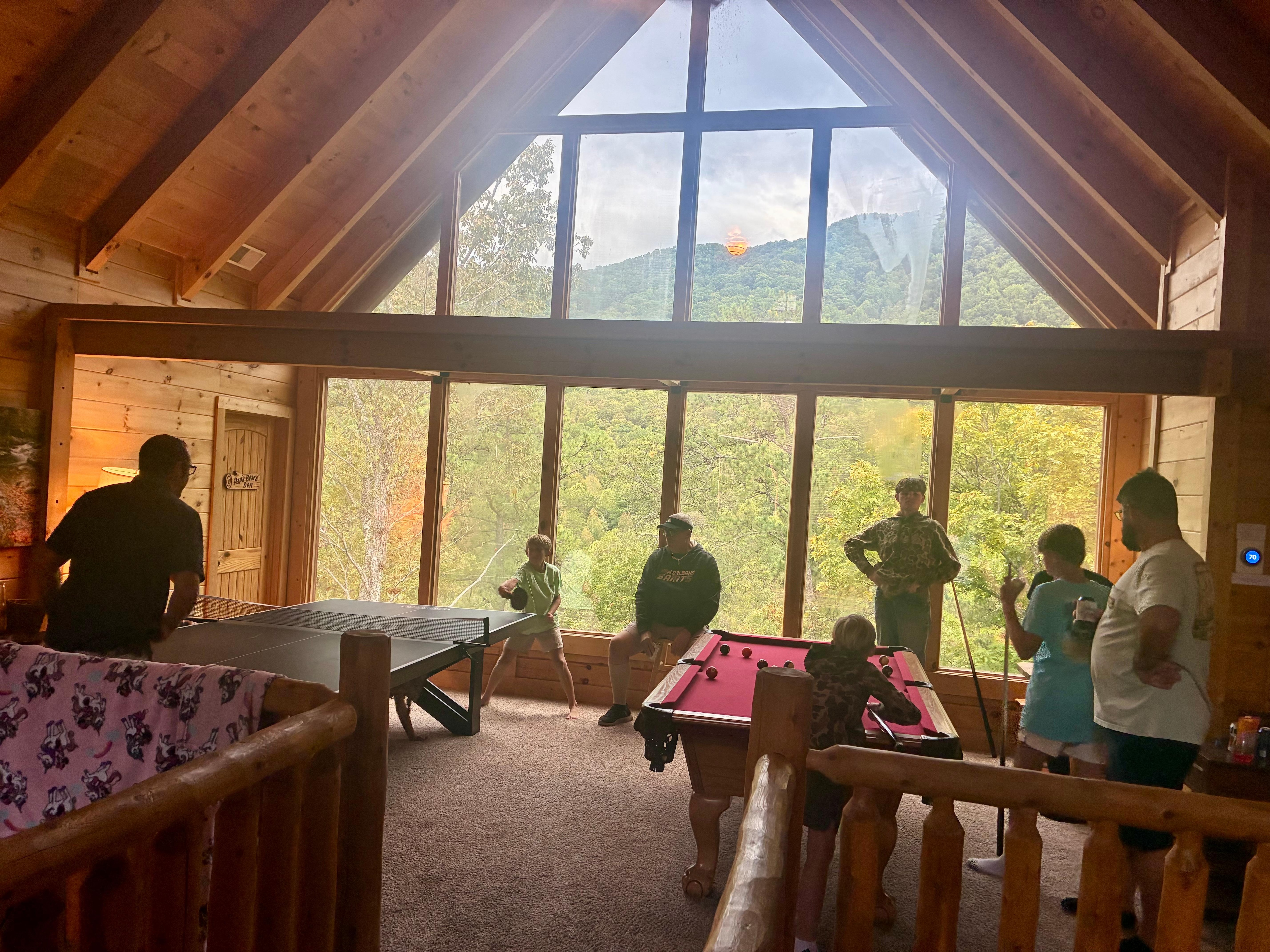 GAME/THEATER ROOM: We have a very large hi-def, smart 65 inch TV, surround sound, and 10 leather recliners for your movie enjoyment! We offer a ROKU system on the theater TV (and all TV's in the cabin) which offers hundreds of apps where you can sign on to your account and watch all your favorite shows or movies, and lots of free channels too. The living room also has a ROKU system. We also have a game arcade featuring tons of games like Pacman, Frogger, and more, a fooseball table, a full-sized ping pong table, and pool table for lots of fun! Downstairs we offer several board games for hours of family fun.