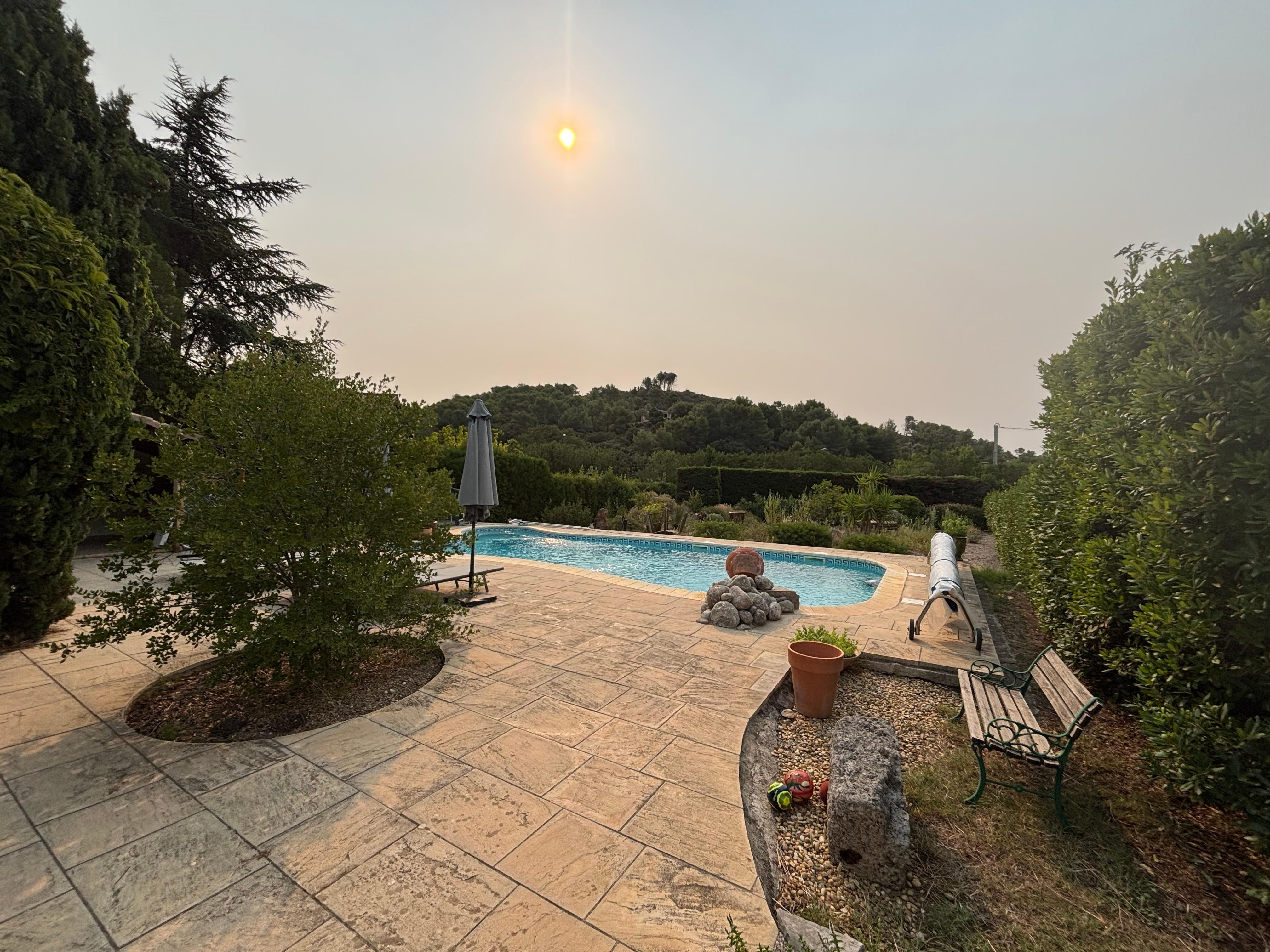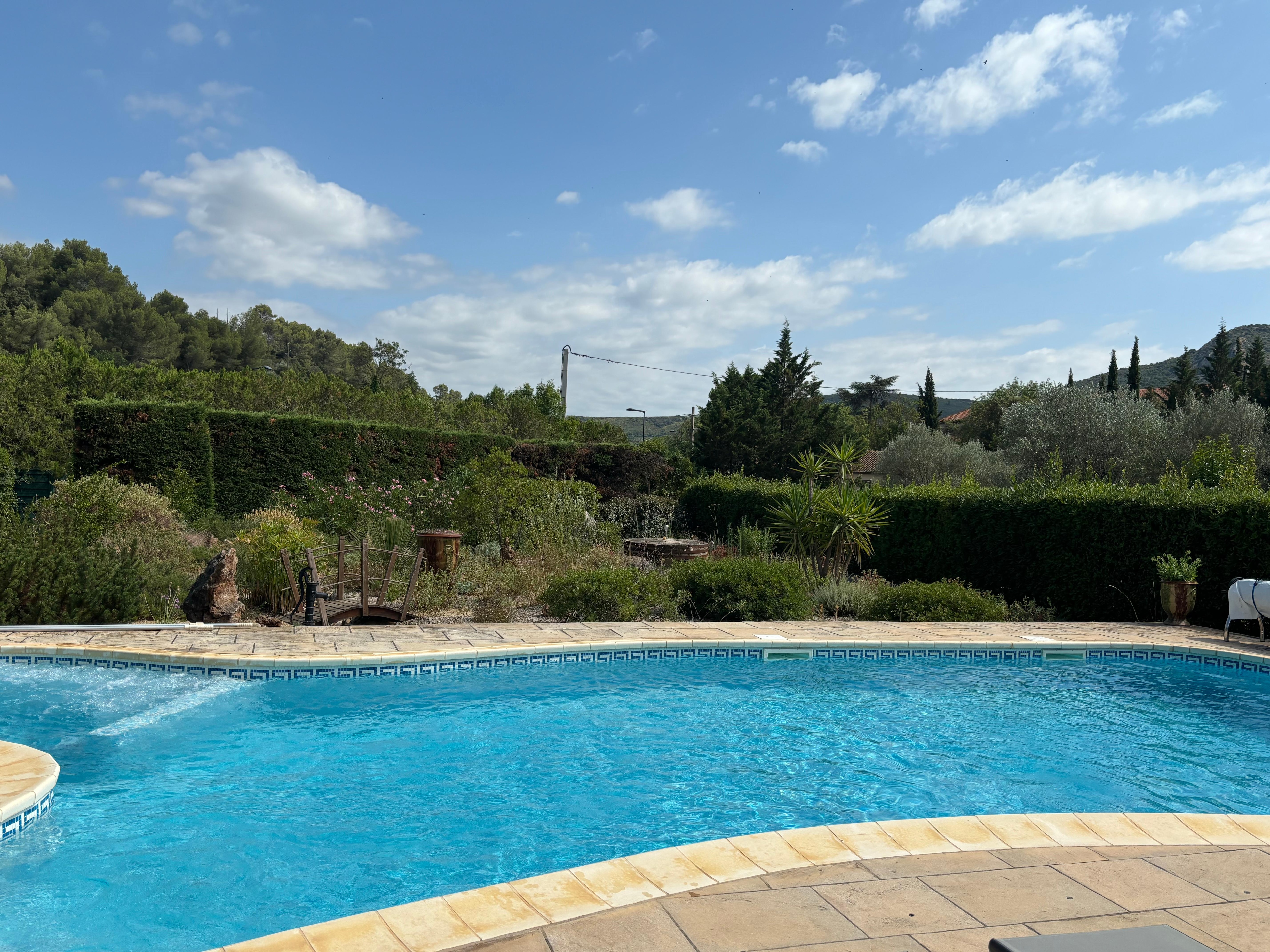 Outside: covered terrace, barbecue, summer kitchen, private swimming pool (bromine, 10x5), jacuzzi, garden, garage; all in a small village of 500 inhabitants, with amenities (bar restaurant, grocery store, post office, wine cellar). The whole village is surrounded by scrubland and Mediterranean forest. Altitude from 90m to 480m