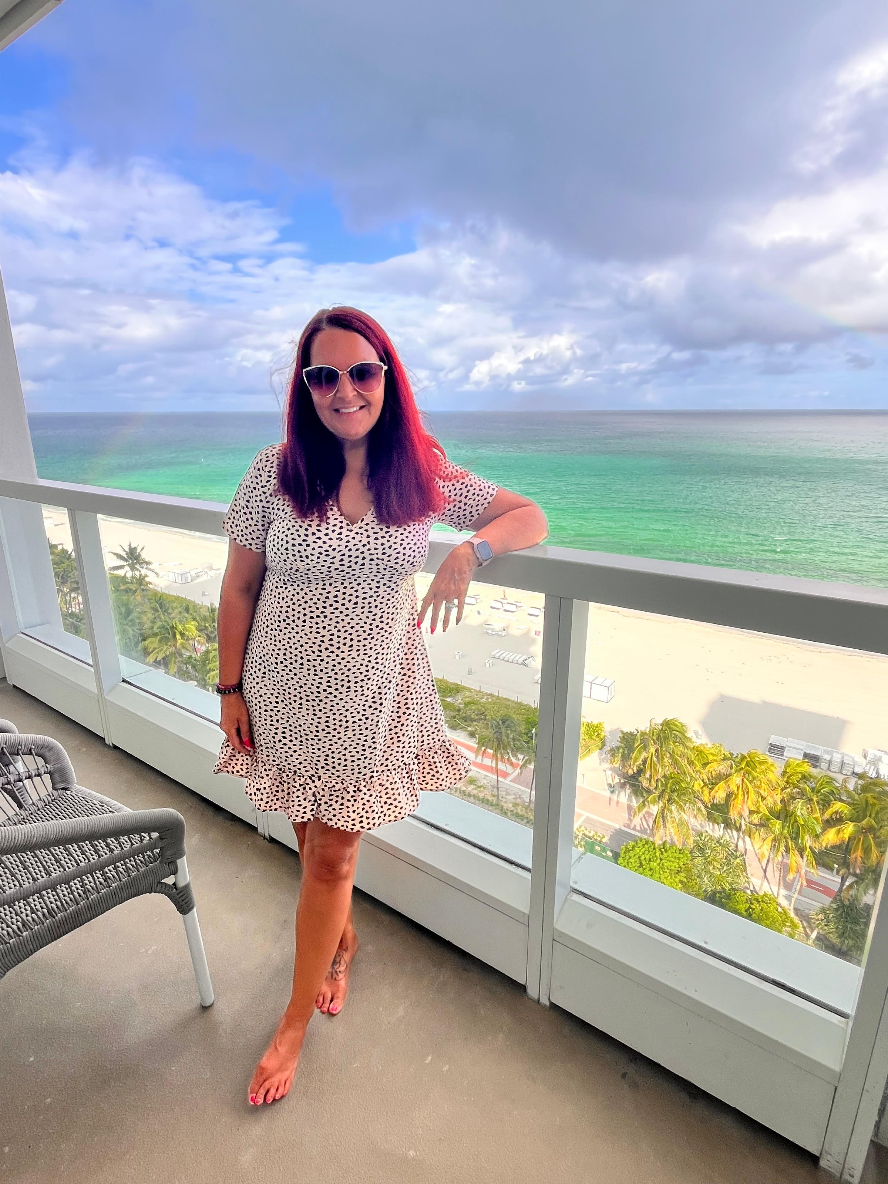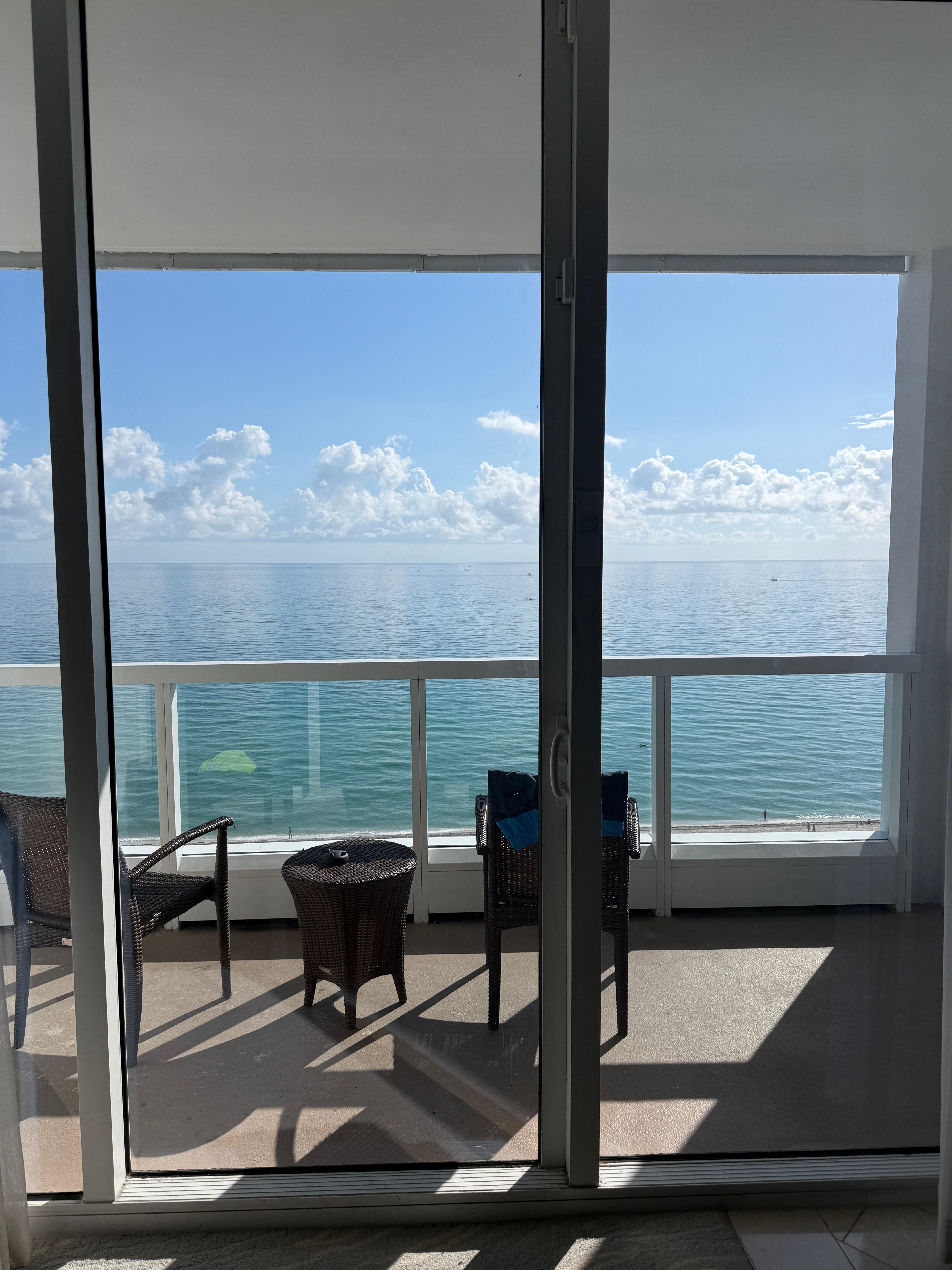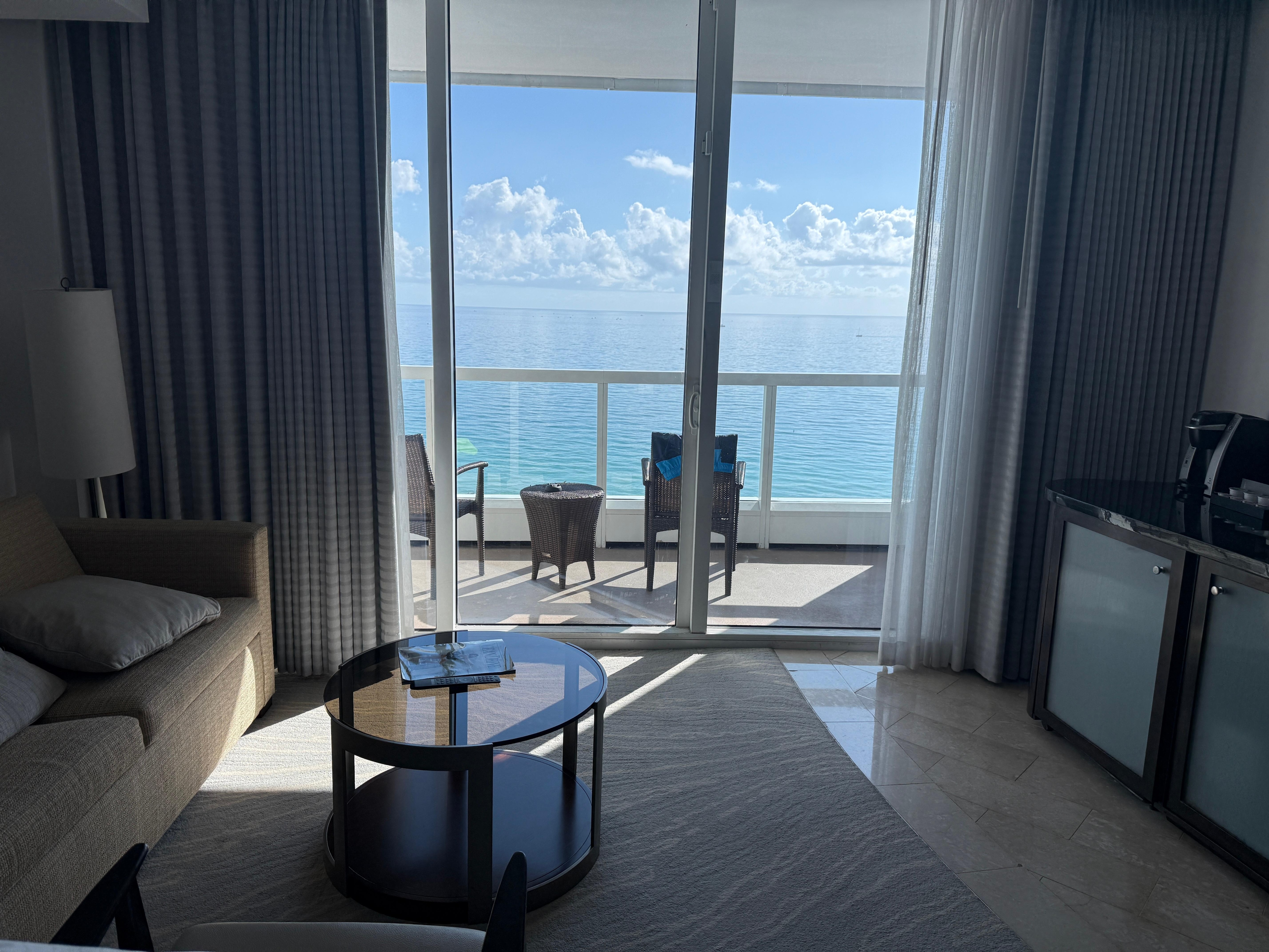 Fontainebleau Hotel's Sorrento Tower 550 sq ft oceanfront Junior Suite apartment. Kitchenette (mini-fridge, sink, microwave), balcony and 1 full bathroom. Access to Hotel's facilities and 2 spa passes (grants access to the Fontainebleau Lapis Spa) are included in the rate.
