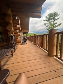 There are two large, covered decks just off the kitchen, on either side of the large dining area. One has a large commercial-grade 5-burner Broil King Regal 520 gas grill with plenty of space for meal preparers. The other deck, also covered, has outdoor tables and chairs for those who would like to enjoy their meal outdoors gazing at the Smoky Mountains, as well as rockers to sit and relax.