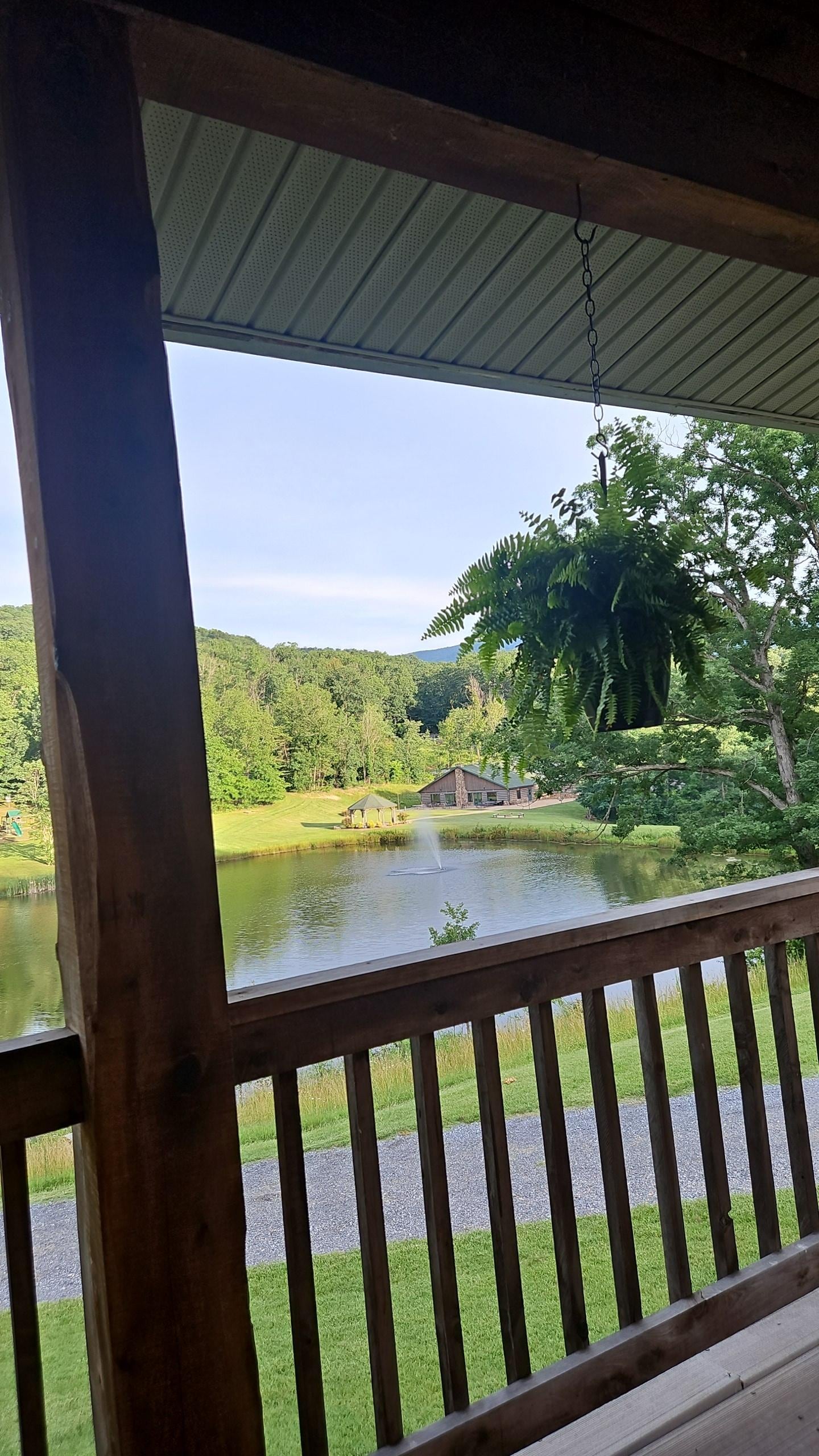 On main floor has large front porch overlooking the lake. Great for morning coffee enjoying the mountain views and water.