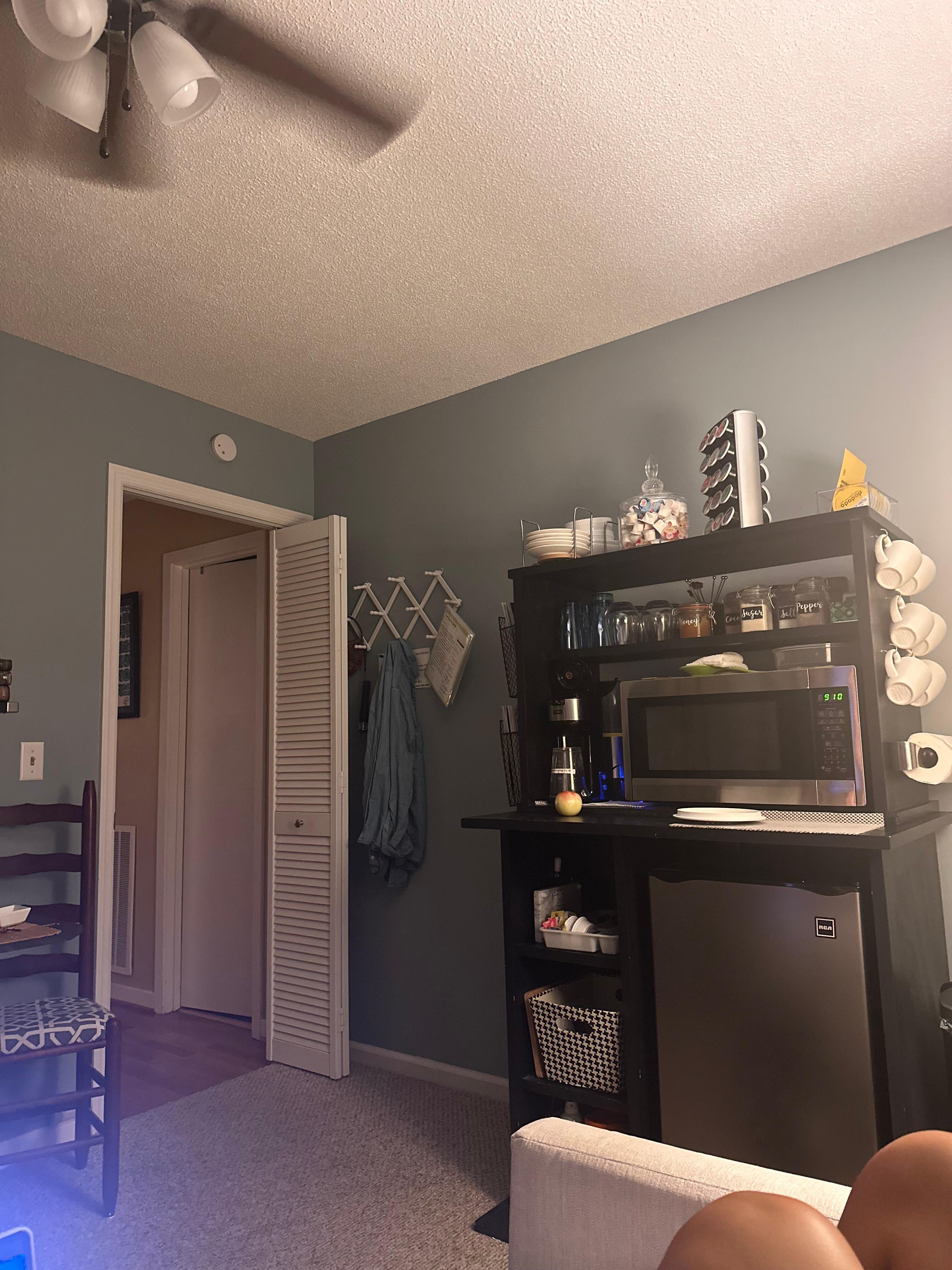 Relax and have your morning beverage in our TV lounge. We've stocked the coffee/tea bar with the supplies necessary to make your stay comfy. The Keurig-like coffee maker is quick and hot and “pods” are provided. You’ll find fresh filtered water in the refrigerated Brita pitcher. The microwave allows for quick heat-ups for your drinks or any food you may choose to bring in. Our guests use these items frequently to cook simple meals. There’s also a popcorn popper for those late-night hunger pangs.