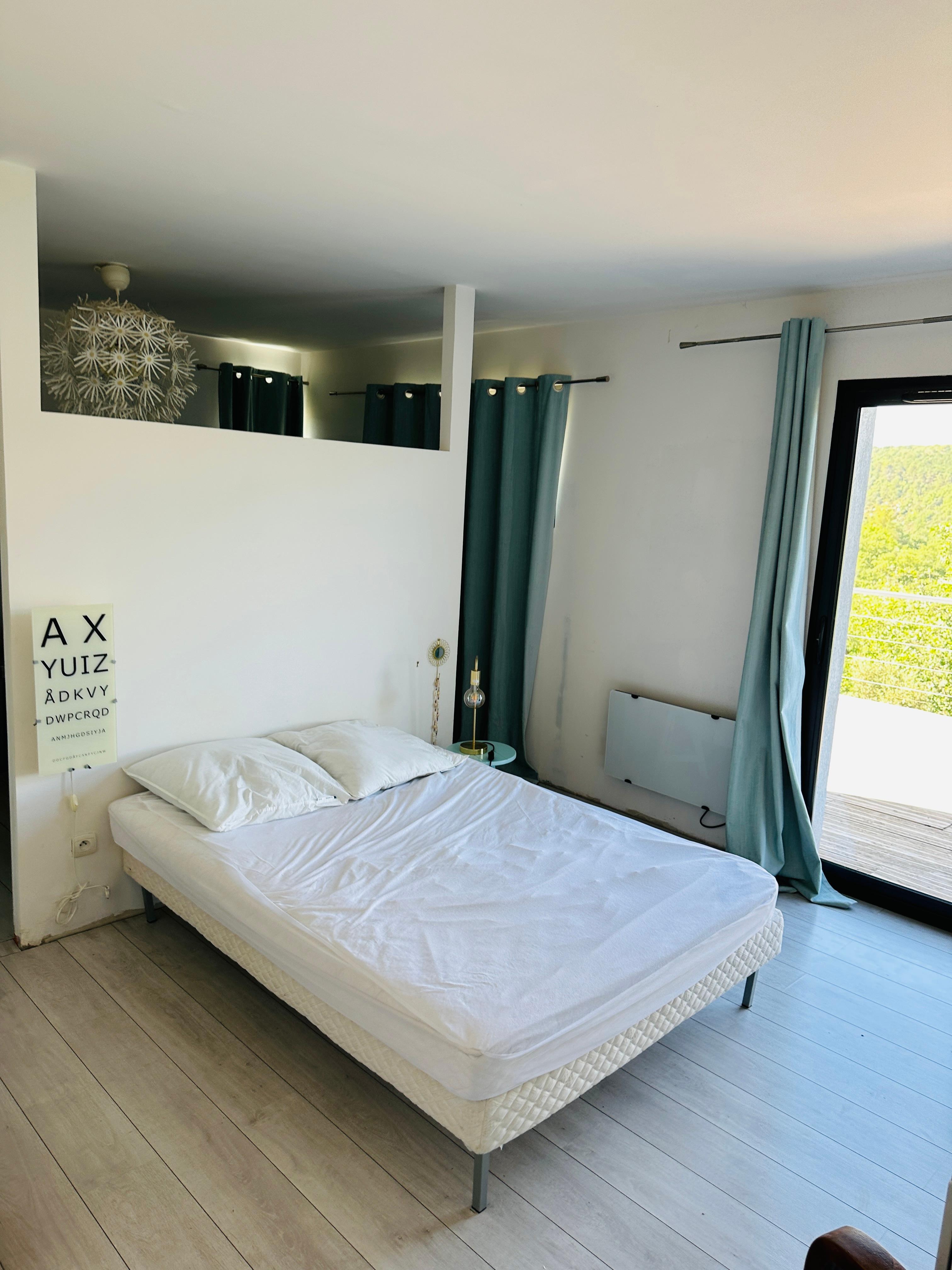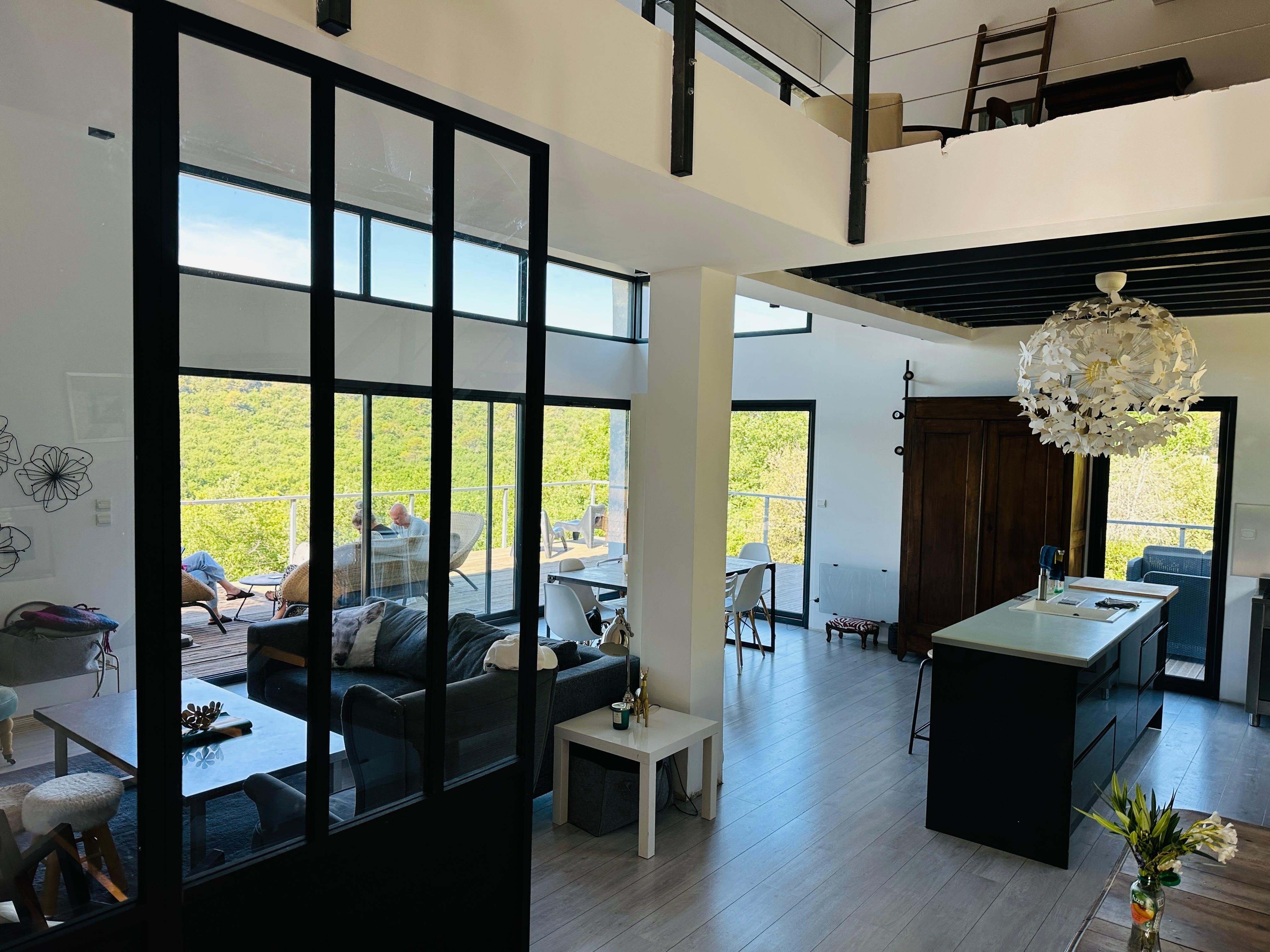 The house has a south unobstructed view, a terrace of 120 m2, a large living room of 60 m2, a mezzanine, 3 bedrooms, and 2 bathrooms,