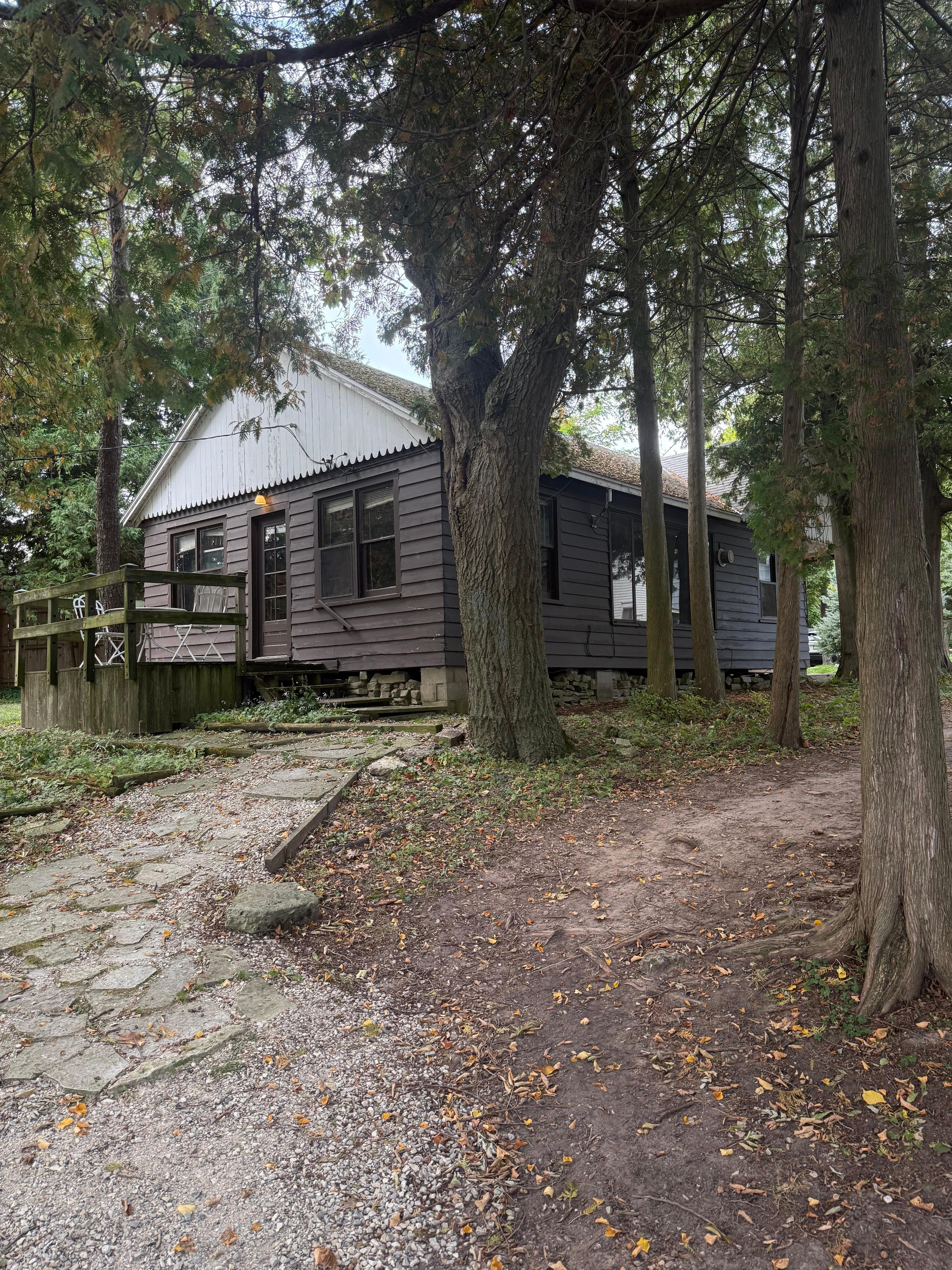 This listing is for Pineaire Home… a rustic, traditional, vintage cottage which is cozily snuggled into the wooded shore of Sawyer Harbor. A large picture window in the dining area overlooks the water of Sawyer Harbor and Sturgeon Bay. There is no better place to appreciate the peaceful morning view with warm cup of coffee in hand, or savor a nourishing dinner, infused with belly laughs and liveliness with the closest loved ones, enjoying the changing views with the setting sun. In Pineaire Home you will find a completely furnished kitchen, one bathroom with an antique claw foot bathtub and shower, a living room centered around a hand crafted Door County limestone fireplace and two bedrooms...both of which queen beds inhabit. On the south side of the living room, original double glass doors open up into a bright and comfortable sun porch, with two built-in twin beds and a pair of poofy loungers which are the perfect place to relax with an evening read after a sweetly savored day. ↟↟↟
