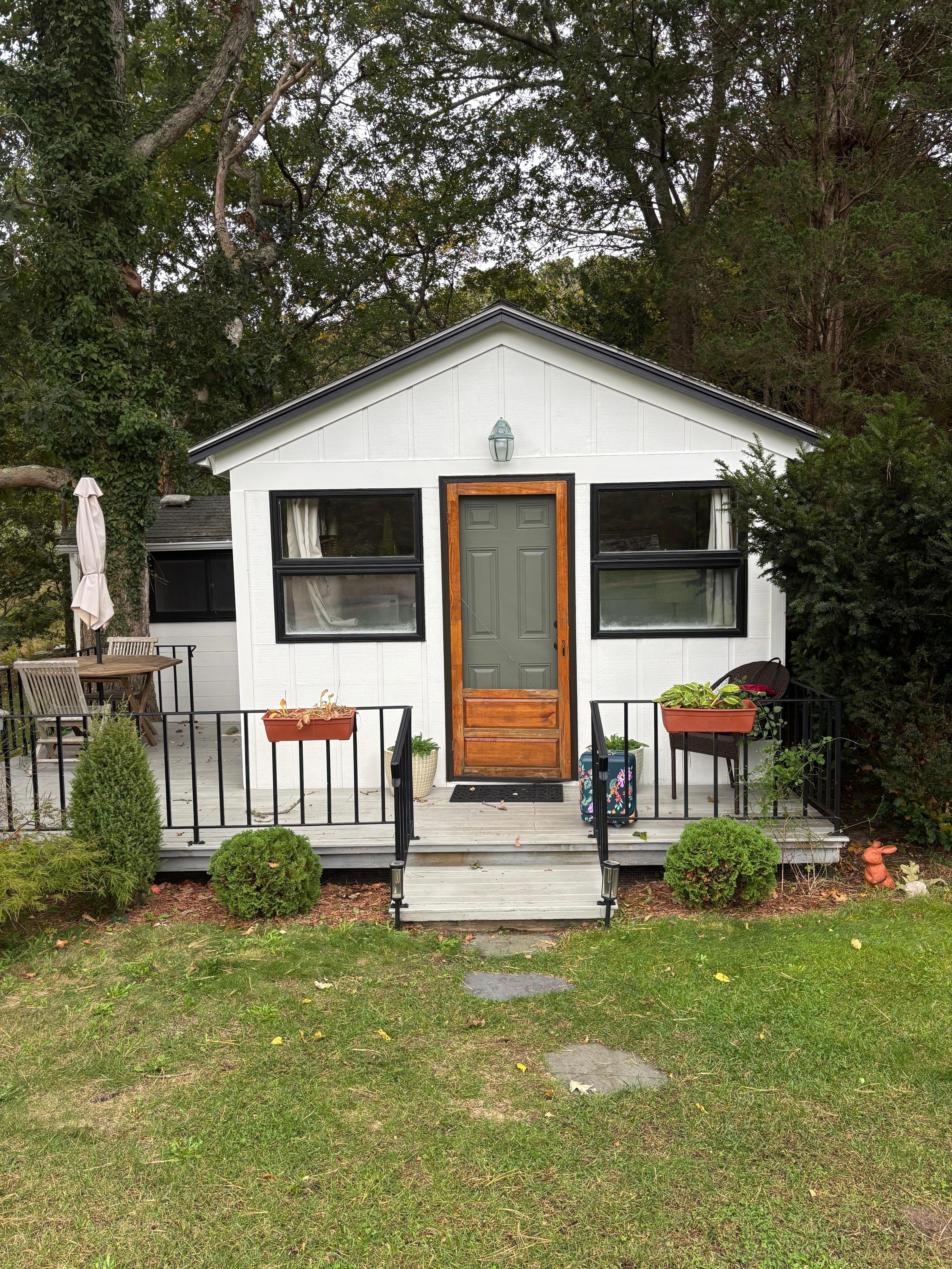 Small private cottage on a large quiet property nestled among tall trees with a wrap around deck. Perfect for a couple’s getaway weekend. Walk to Vineyard Haven shops, restaurants and Owen Park beach. It's one mile to town and the ferry (5 min drive/20 min walk with sidewalks). Home features vaulted ceilings, sitting room with kitchenette, coffee + tea station, mini fridge and microwave. Includes beach towels, toiletries, hairdryer, iron. Queen bed, AC, and bath with tub & shower.