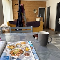 The kitchen includes a ceramic hob, an oven, a microwave oven, a dishwasher, a combined fridge-freezer, a coffee maker, an electric kettle, a toaster, grill raclette pierrade grill. A cot and high chair for baby at your request.