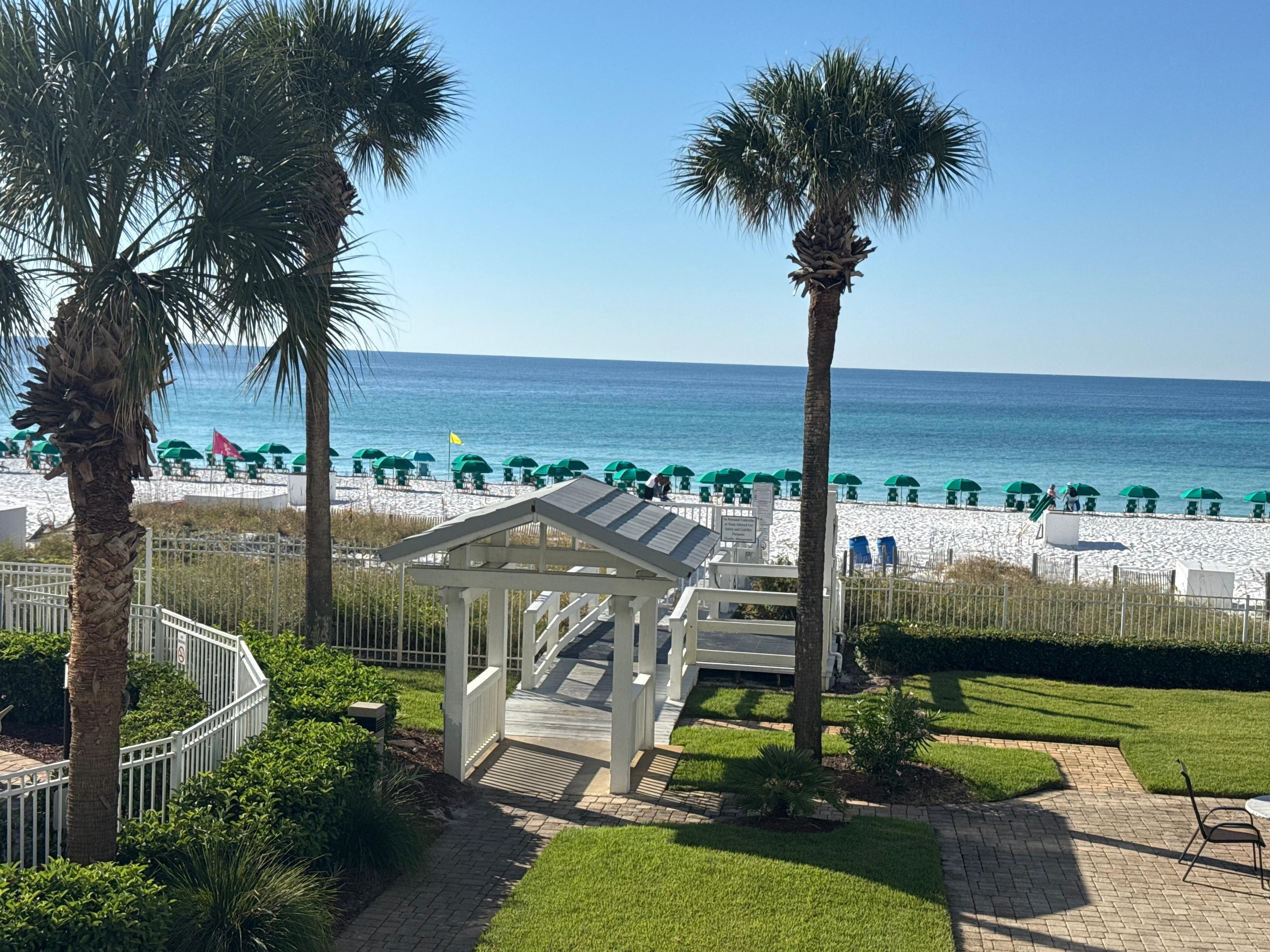 Location is everything! Sterling Sands unit 112 is located DIRECTLY on the beach and is GULF facing- no roads to cross to reach the beach! The heated, outdoor pool and hot tub are also gulf front. Sterling Sands is one of the area's least crowded beach fronts. A private fitness center for guests and barbecue area are also located beachfront on the property. Two beach chairs and a large umbrella set-up are included in your rent (March 1 - October 31, 2025 only).