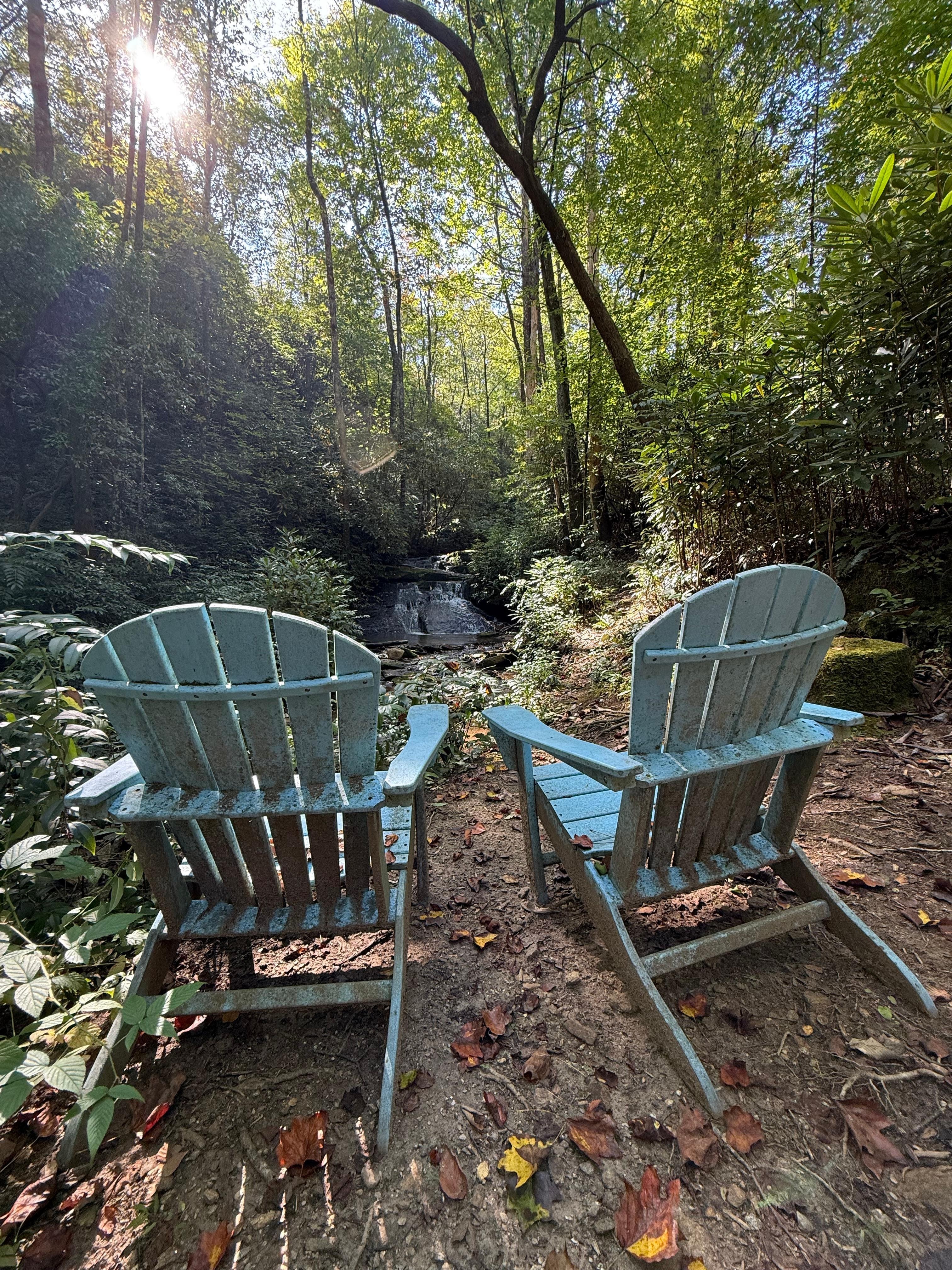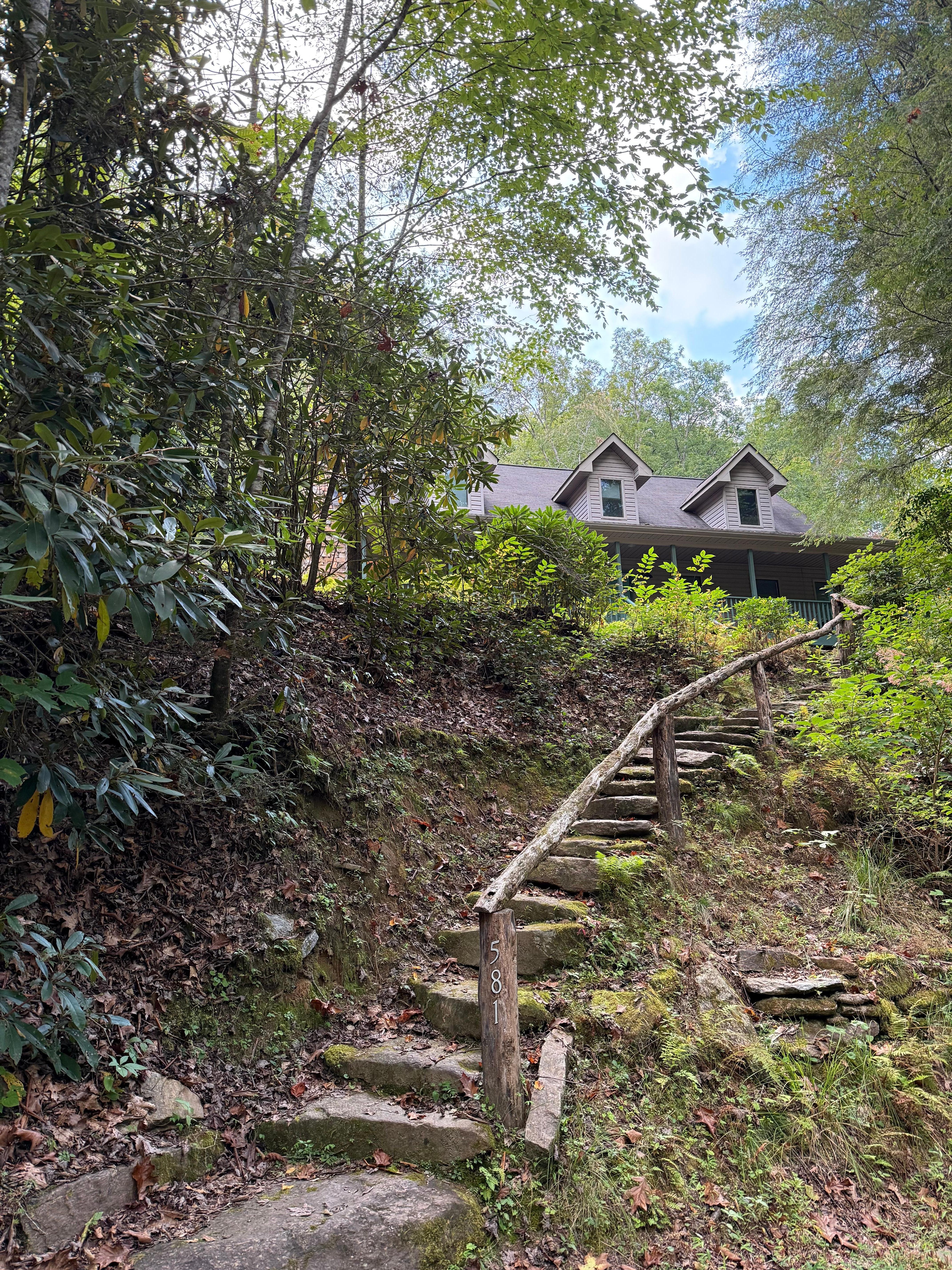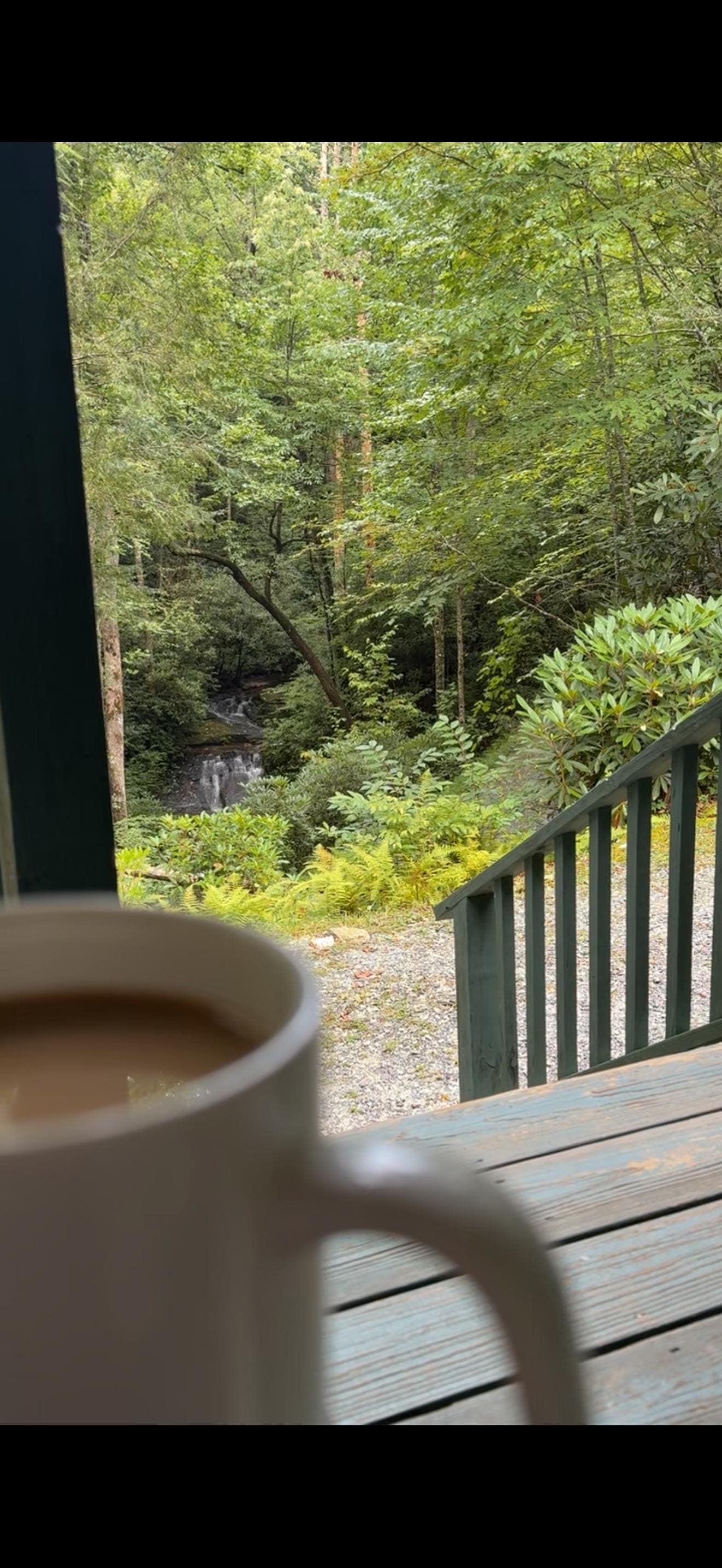 Relax on the front porch of this North Carolina mountain house, near Brevard, with your favorite beverage or book and enjoy the view and soothing sounds of your own private waterfall. Walk down to the waterfall to cool off, wade in the pool at the base of the waterfall, or just sit nearby and take it all in.