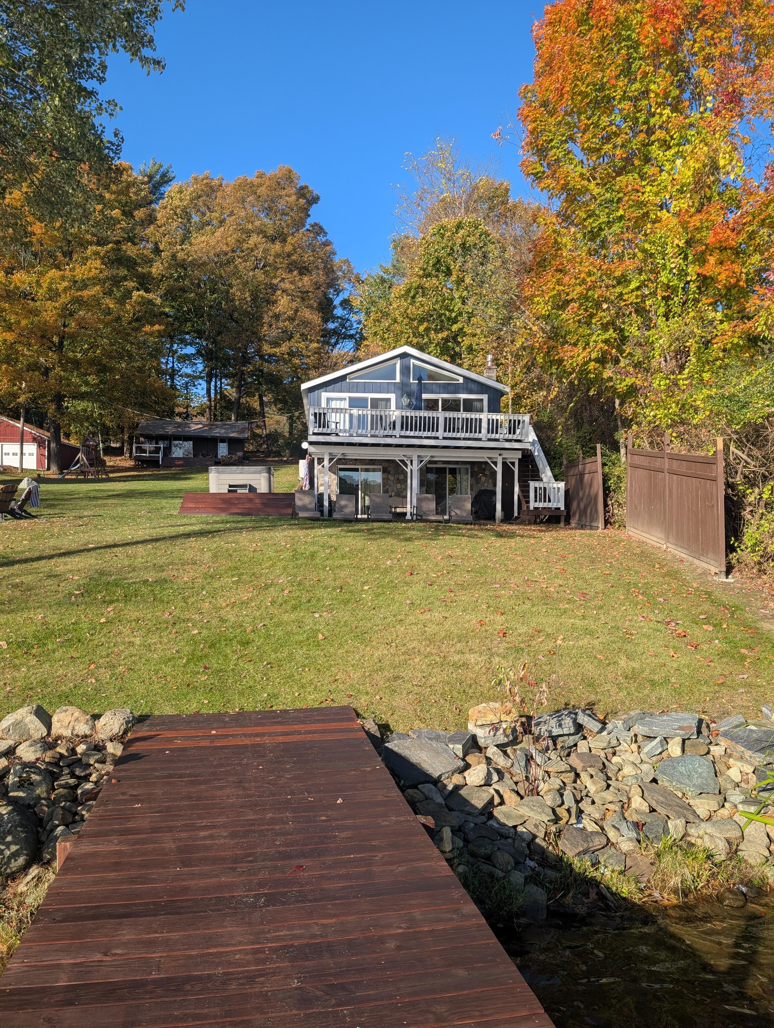 Enjoy the pure waters of the Adirondacks at this private lakefront home in the Lake George Region. Located on Hadlock Lake in Fort Ann, NY, this lakefront vacation rental sits on one acre of private land and is only one of the few properties with a large private yard, a walk-in sandy beach, and a six-person outdoor hot tub! It is a perfect year-round vacation spot. The two docks have space for a 22′ boat and are also an excellent place for early morning fishing. The dock space and beach are private to the home. Enjoy the floating dock for swimming and more! There’s a BBQ available for outdoor cooking, upper and lower patios near the water, and a waterfront fireplace for late-night campfires.