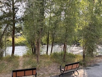 OUTDOOR LIVING: Ground floor patio area, views of the Blue River. Two outdoor patio chairs.