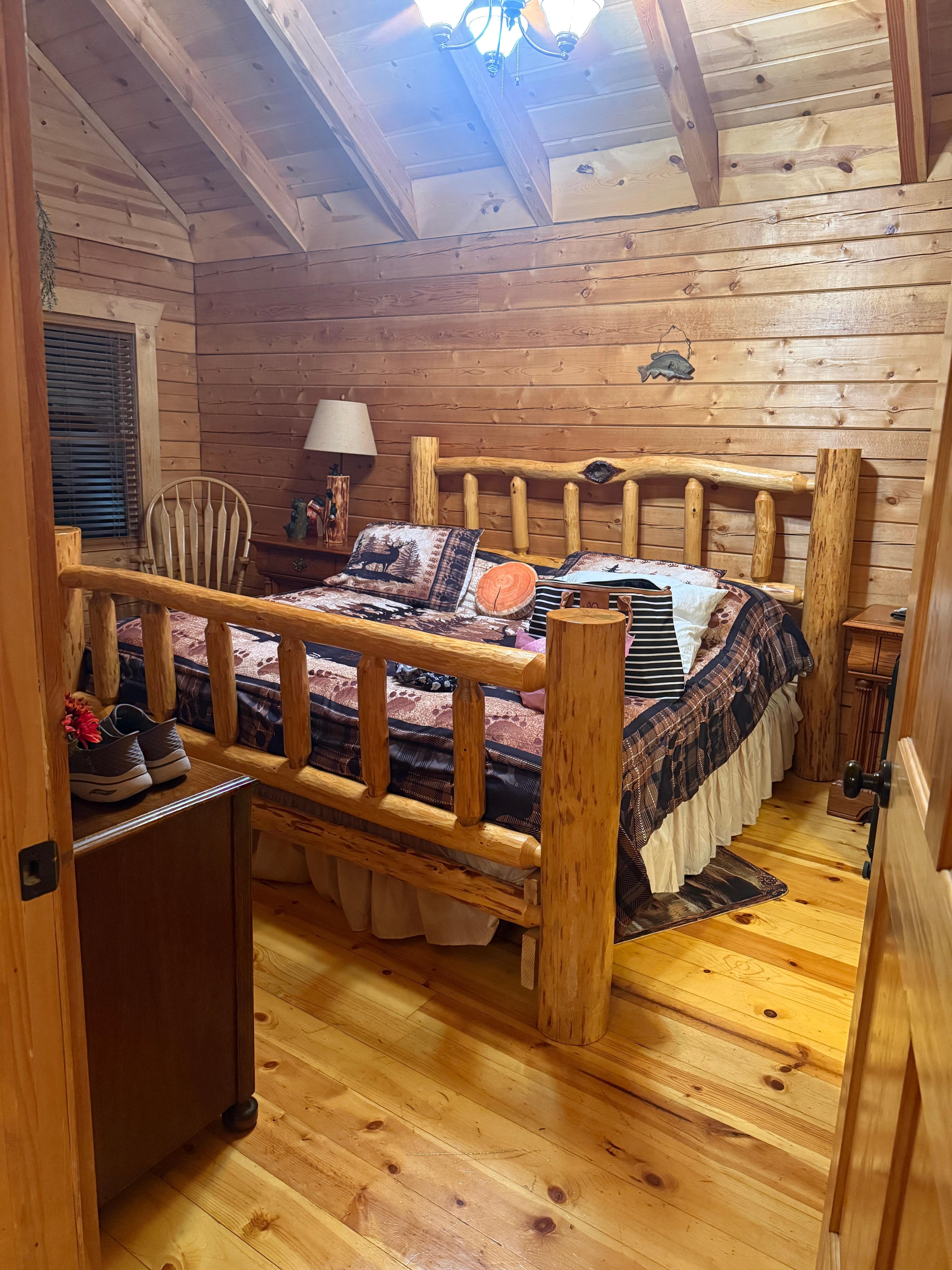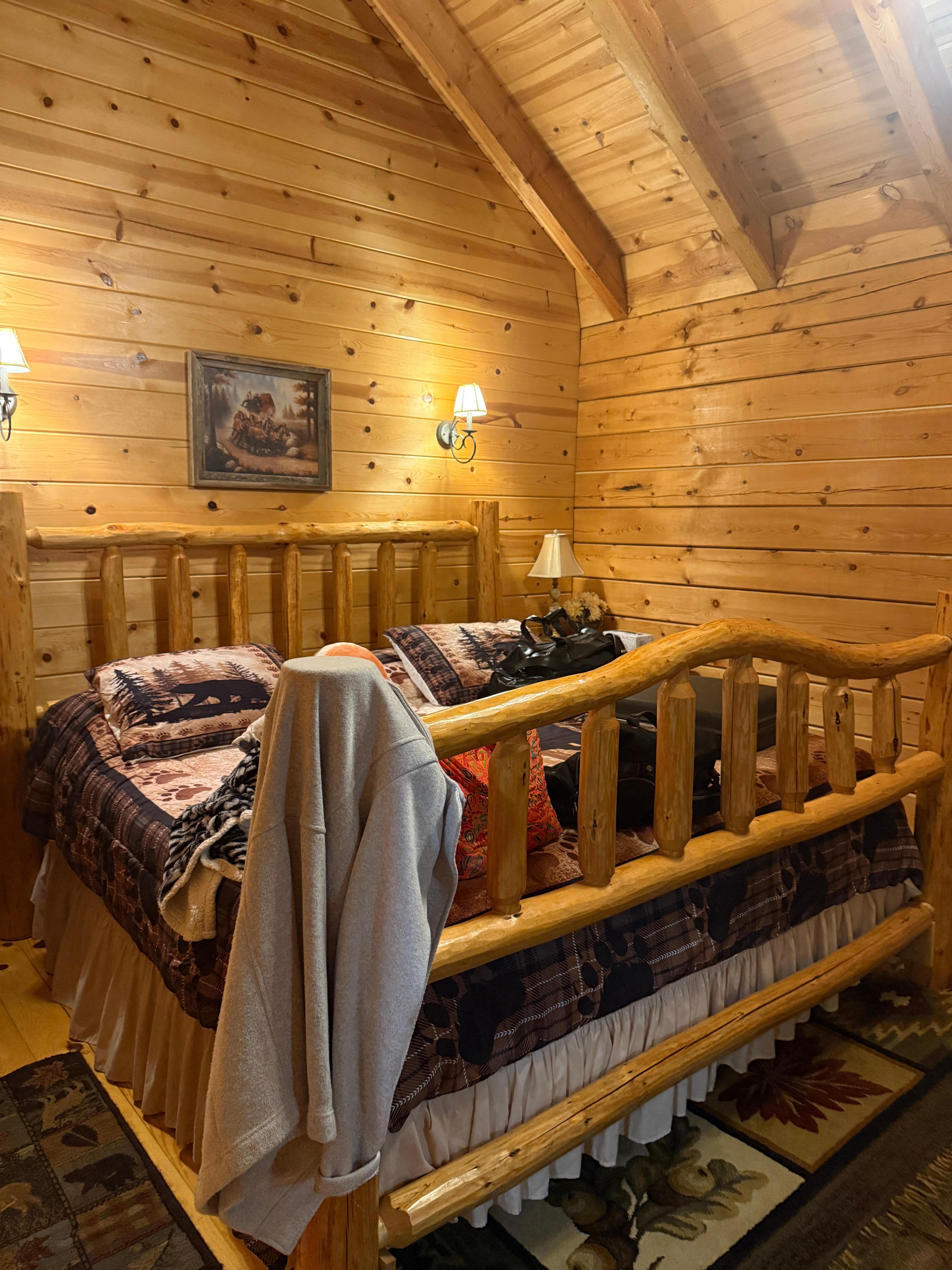 * King Log Beds & Log Chandelier - made from pine logs in creating view below cabin!