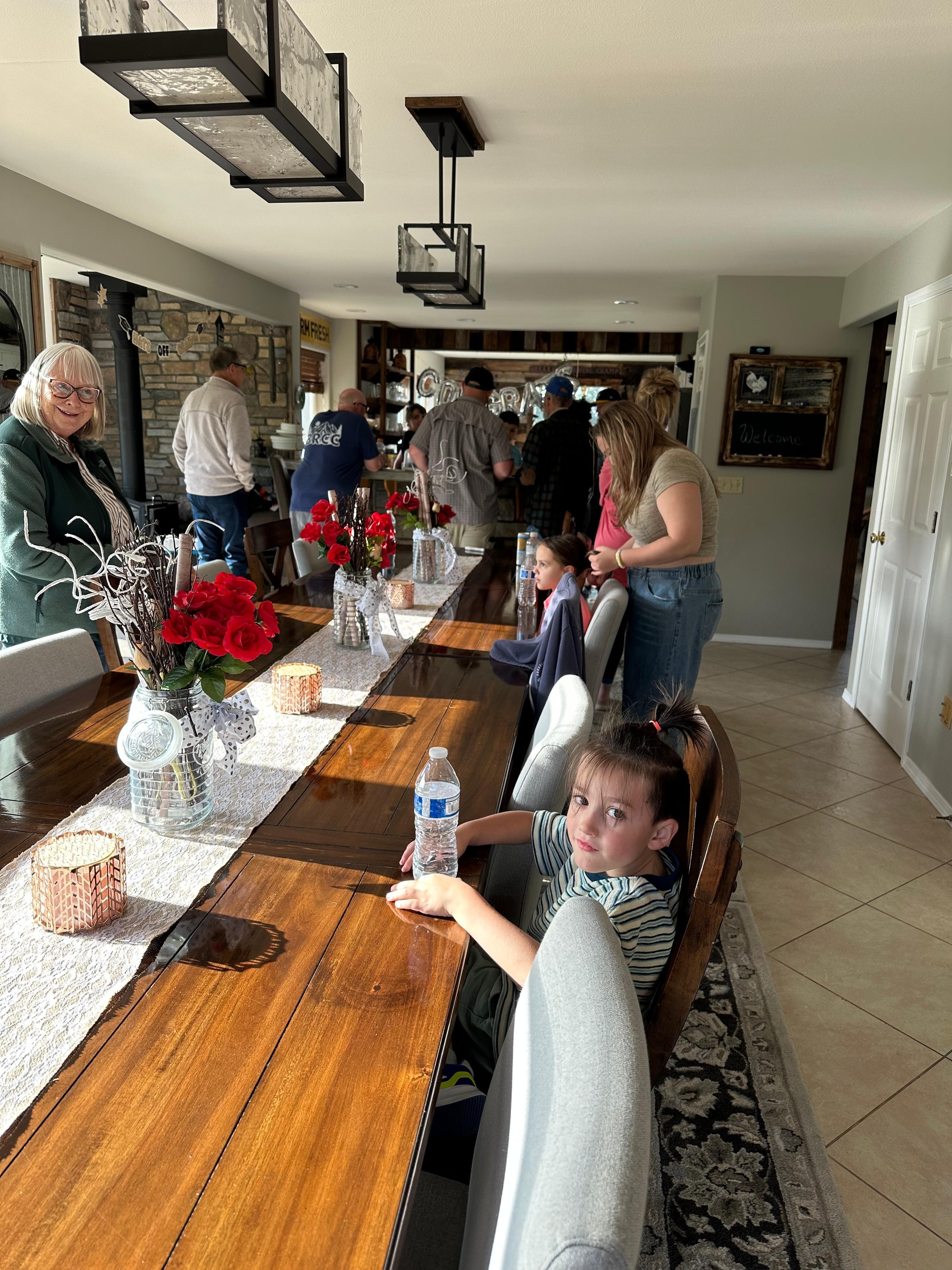 Our home only has a few steps into the main floor for those that are limited to stairs. The main floor consists of a living room/gathering room with a flat screen tv, large kitchen, huge dining area that can seat 12+ people, a second dining area for 8, a master bedroom/bath, additional bathroom, and a mudroom (complete with washer and dryer and a backup refrigerator, for extra food/drink storage for crowds.) The main floor also boasts a large viewing deck of sloping pasture, wildlife, and incredible sunsets. From the deck, there is access to the hot tub.