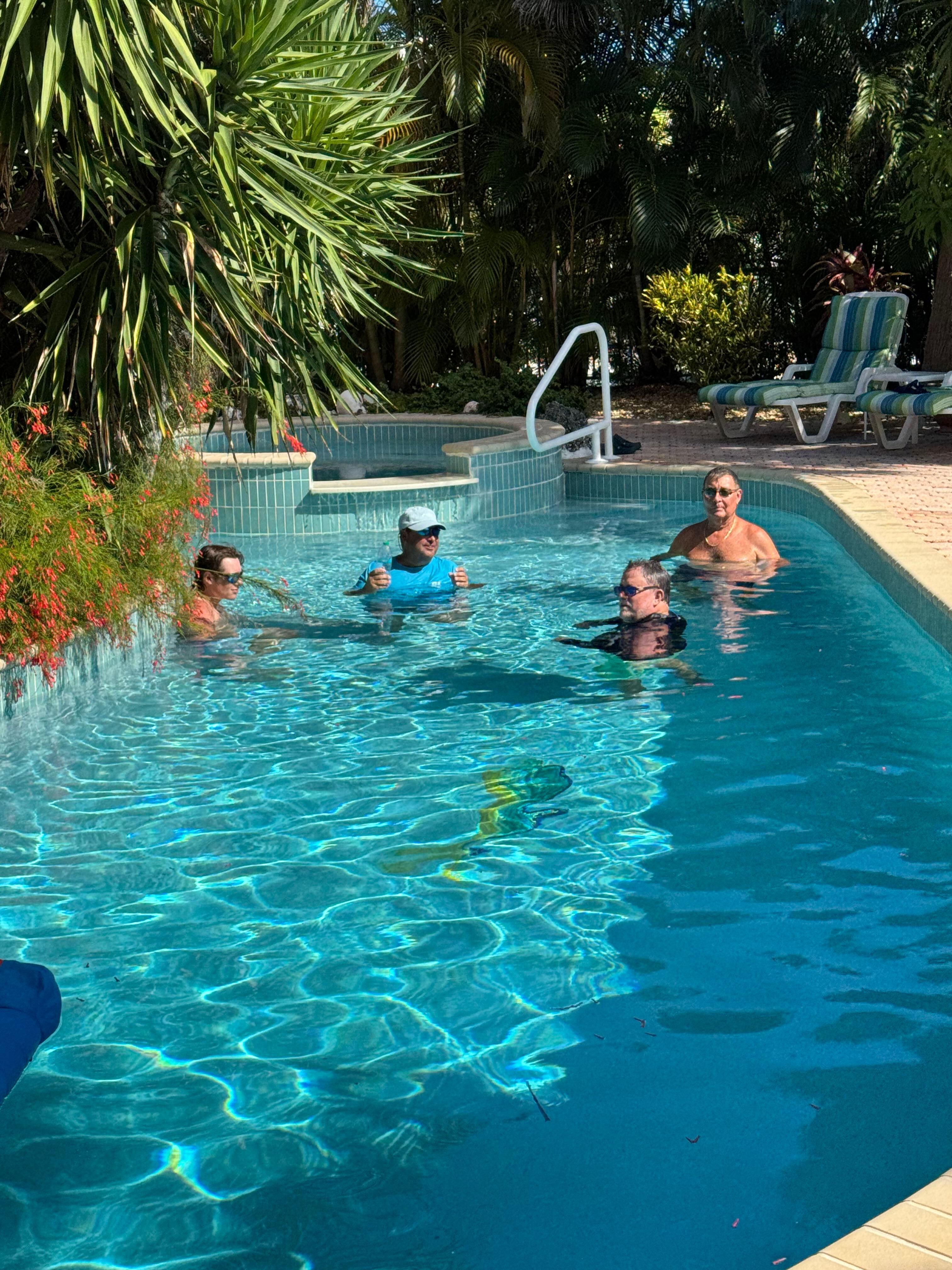 Outside there are wonderful spaces to dine, enjoy the pool , waterfront , and a step down dock with fish cleaning station { perfect for launching one of our four kayaks and getting into boats dockside } . There is plenty of space to keep your own boat . Fishing from the dock is a favorite pastime for the kids. There is also a bait freezer outside , convenient to the dock .