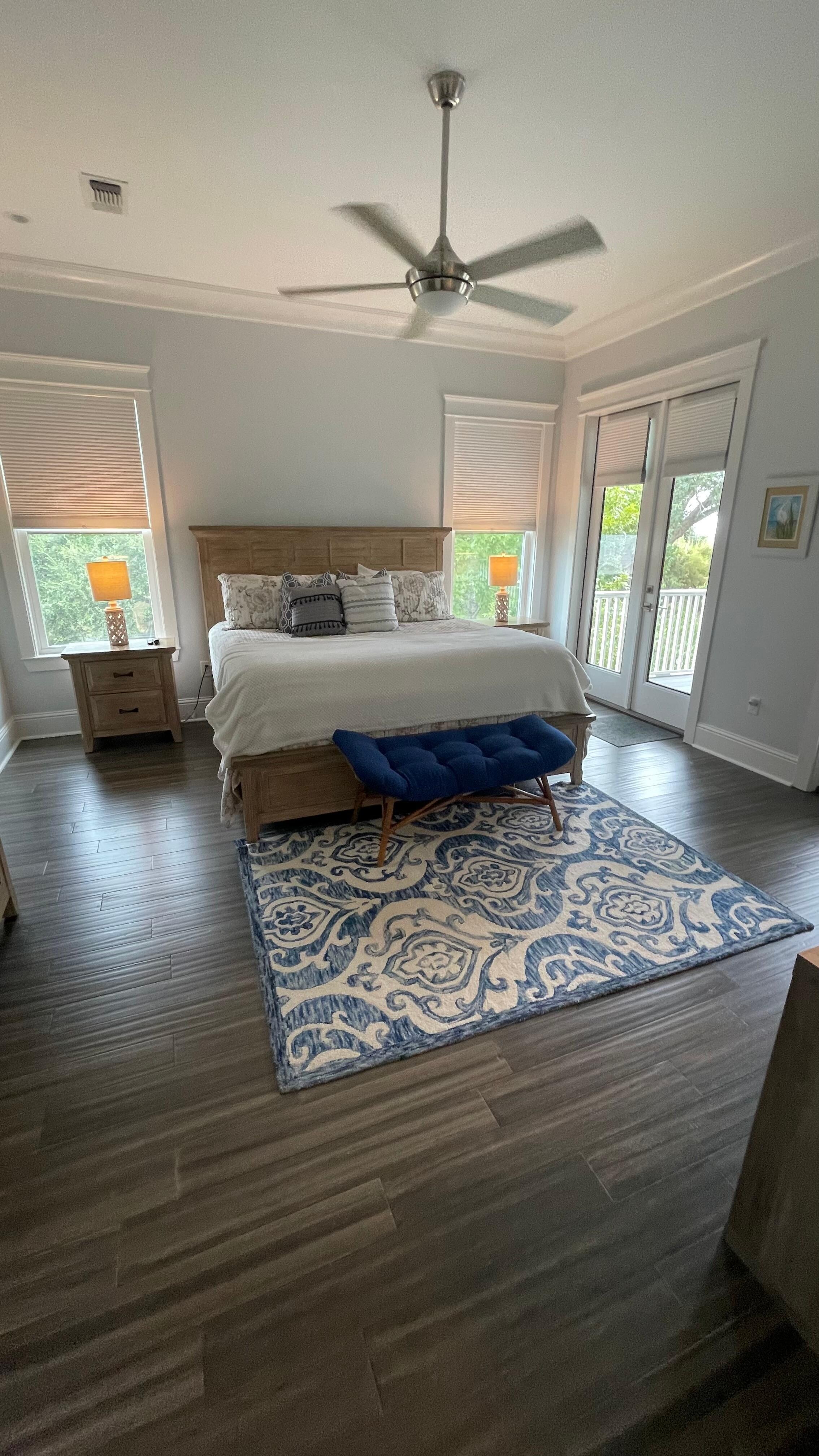The master suite provides a double set of french doors with beach views and porch access. It's comfortably furnished with a king bed and sitting area to enjoy a book. It also has a custom emsuite bath with dual sinks & huge walk-in closet.