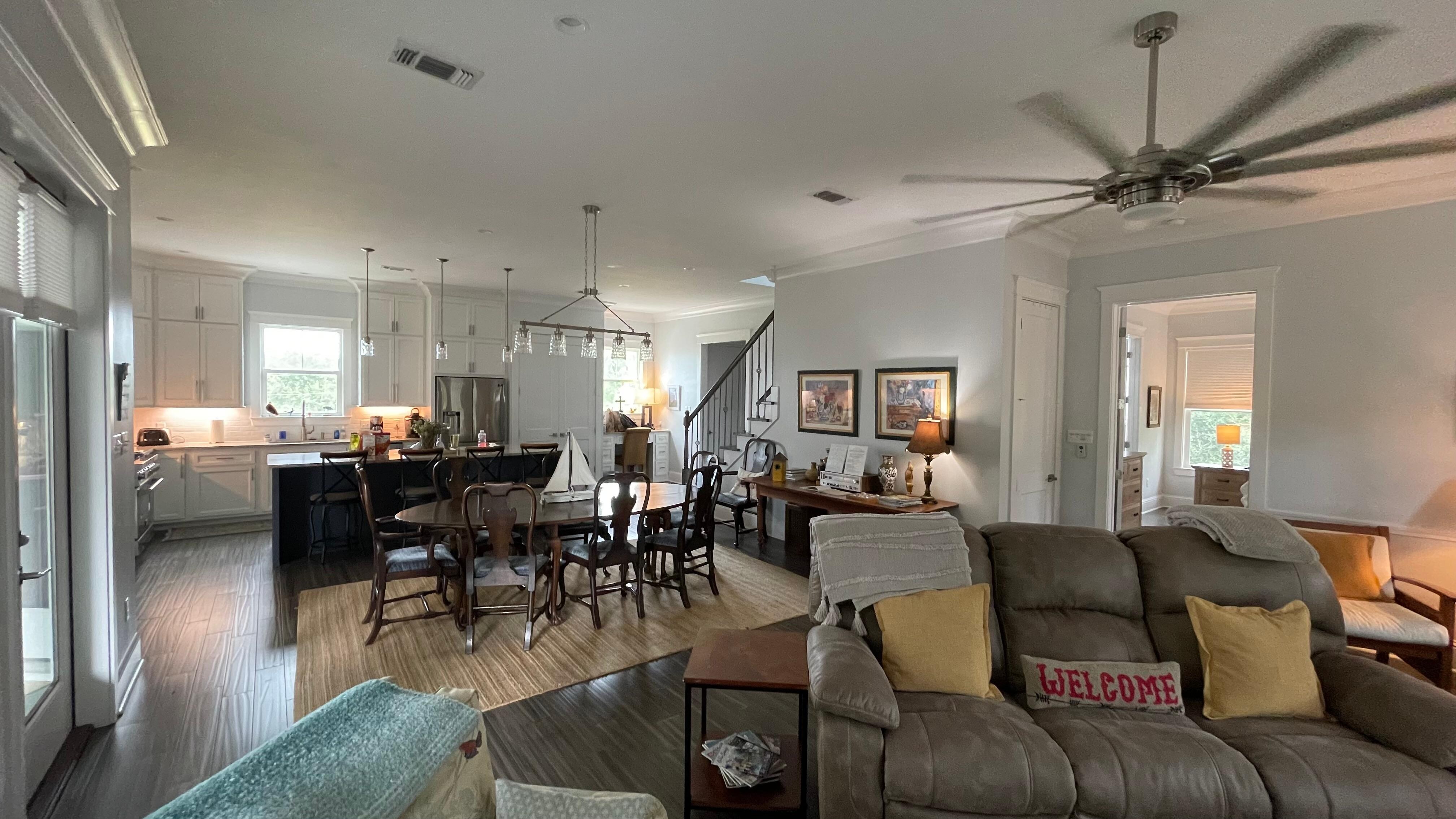 Other custom features of this vacation home are the workstation in the kitchen area, if you need to use a desk setting, with outlets for all your devices, The full-size washer & dryer are on the main floor as well as the half bath for guests.