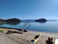 Perfect weather during the Winter months! In the 70’s. There are gorgeous views of the sunrise over the sea. Morning kayaking or paddle boarding with glass like water is phenomenal. Kayaks and paddle boards included. There are venders on the beach nearby offering boat rides, fishing, horseback riding, and also seafood, tamales and other things. Bertha’s is a small market and cafe right across the street. They have very good fish tacos and chicken. The store has a few basic grocery items and beer. There are a few other small restaurants along the way headed north. We grocery shop in Loreto before we head out. We stop in Santa Rosalia if driving there from up north. Mulege is good for filling in.