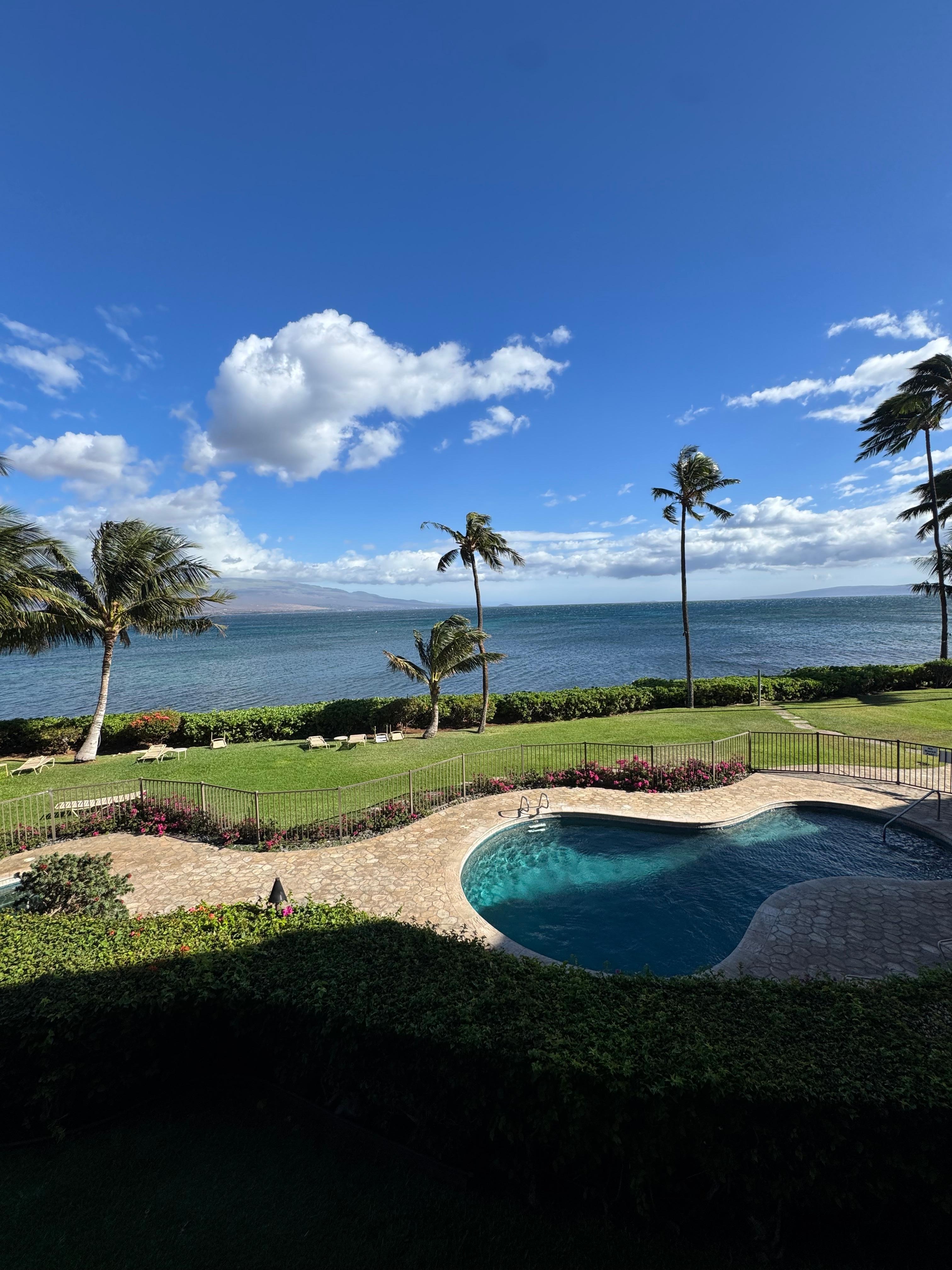 Our condo is direct oceanfront! Maalaea village is a gem with its central location and its fantastic trade winds. They provide a cooling breeze that keeps the temperatures just right. We also have a timer controlled A/C just in case the cross breeze in the unit isn't enough for you. There are ceiling fans in every room as well.