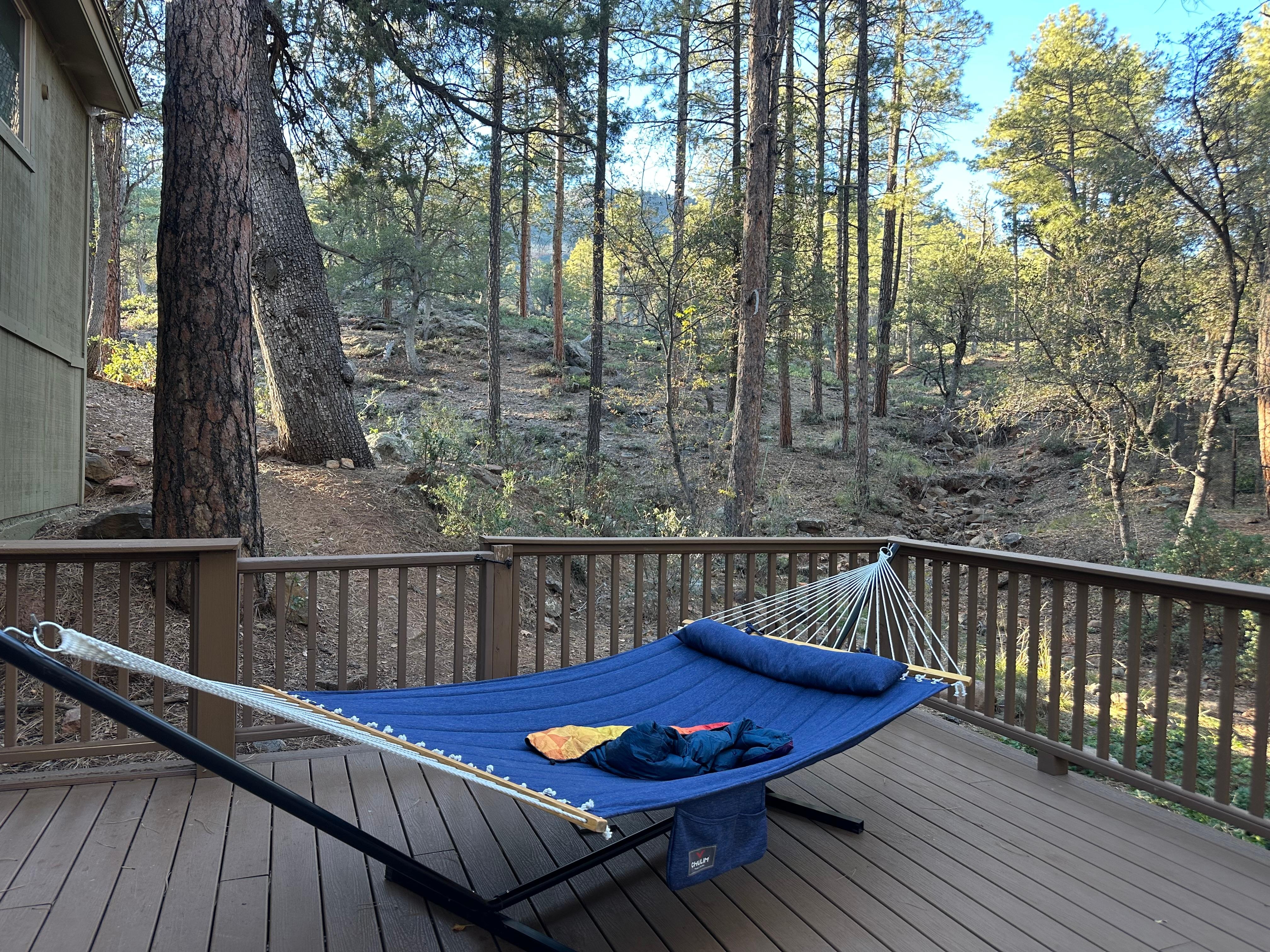 Looking to hike in the forest? Guests can literally walk to the back yard and enter the national forest. Our cabin is in a premier location, 3 minutes from main street on Pine, very close to the world famous Old County Inn Pizza Restaurant, Pine grocery store, yet backs up to the national forest. The front yard is perfect for memorable times with a fire pit and horse shoe pit, all to enjoy the cool pine air and relax.