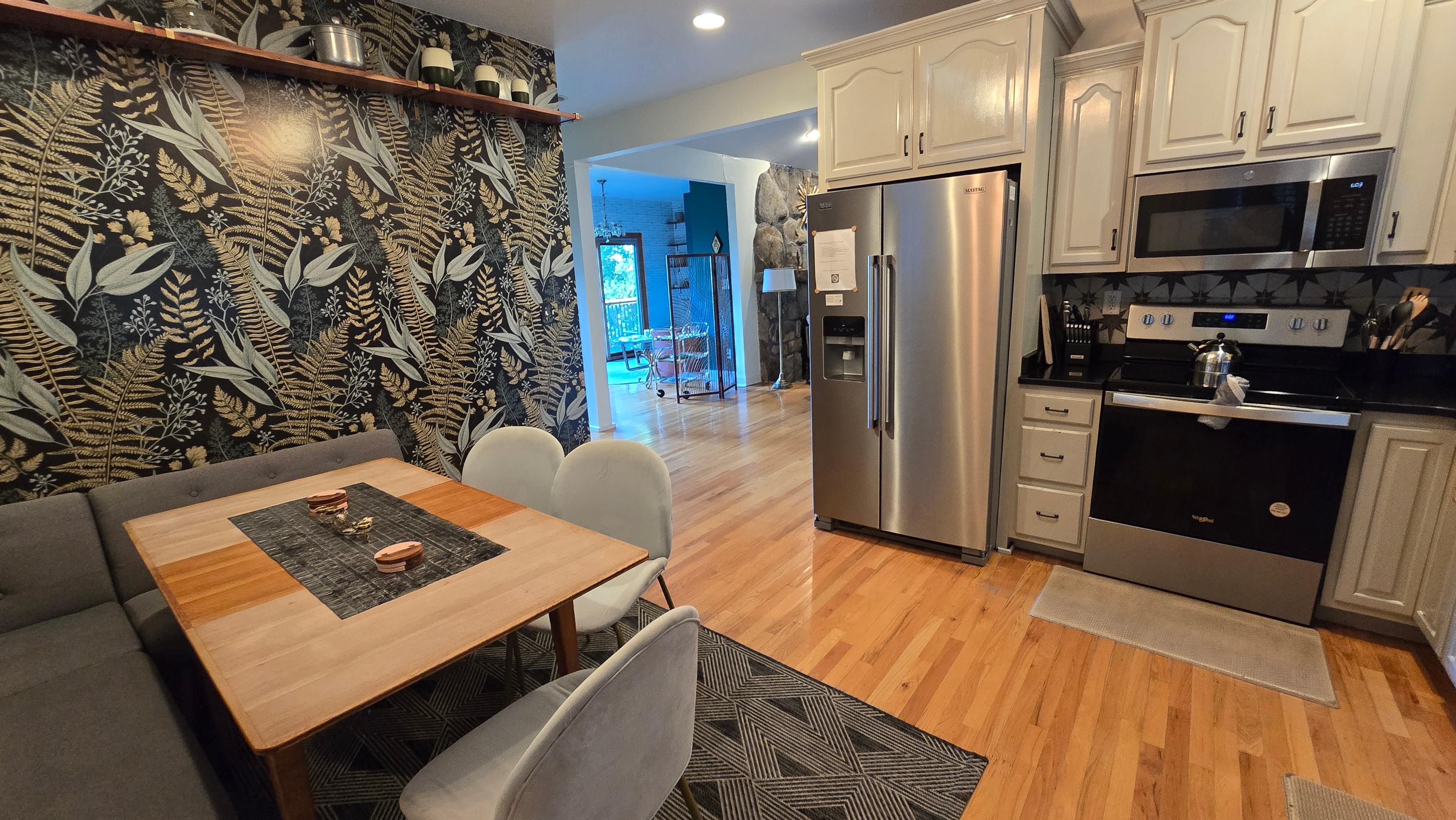 The kitchen is fully equipped and has a family sized fridge and an electric glass-top range with microwave above it. In the kitchen there is a breakfast nook with comfortable bench seating and extra chairs to seat up to 6.