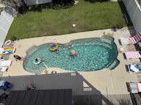 The back yard is awesome! Very private and inviting. The Tiki bar is a great hang-out with 8 swivel bar stools, large SMART TV, sink, mini-fridge, built-in stainless steel cooler and solid wi-fi connection. The lush lawn is perfect for games for all ages. Palms and tropical plants give a cool Caribbean vibe. The summer sun soaks the pool all day and the late afternoon offers shade. The Bull built-in gas grill is powerful. An 8 foot picnic table promotes family outdoor dining beside the pool. And the kids will love the pool's multi-light show at night (switch on column at bar...just flip it on/off to advance the settings).