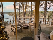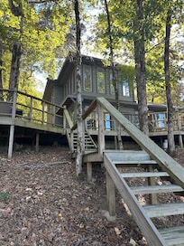 This newly remodeled 2 bedroom, 2 bath house is nestled in nature sitting on 15 wooded acres with 825' of lake frontage on beautiful Lake Hamilton's main channel. Inside the home you will find lots of light and views from every window. Enjoy the LED fireplace, stainless steel appliances and 60” TV. There is a king bedroom and ensuite bath downstairs and a queen bed in the upstairs loft. The loft upstairs provides the ultimate views and gives you the feeling of looking out from a treehouse. The loft is made private by closing sliding barn door panels.