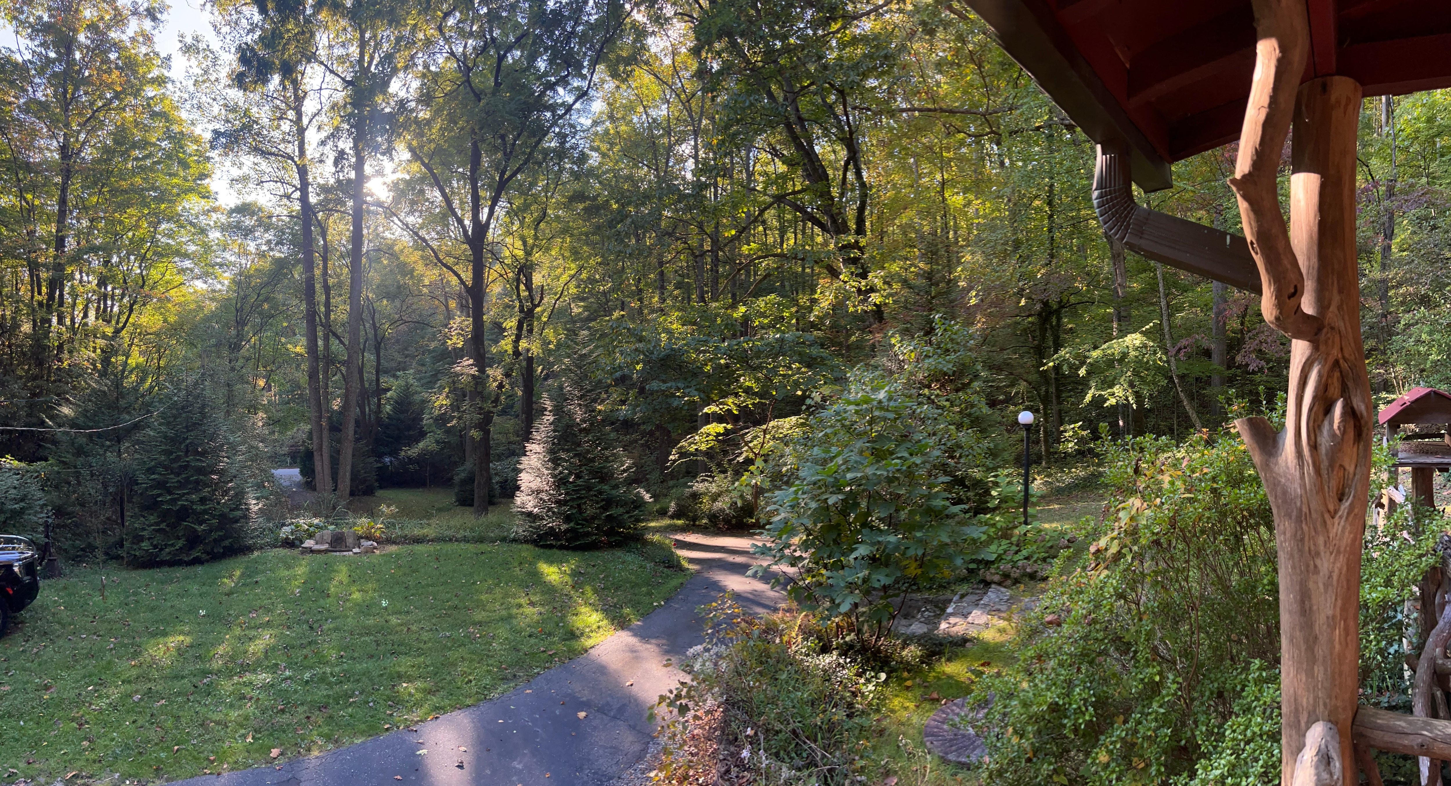 Sit on the covered wrap around porch with its natural mountain laurel railings, listen to the soothing mountain stream that flows through the property, or slip into the two-person hot tub for a soak.