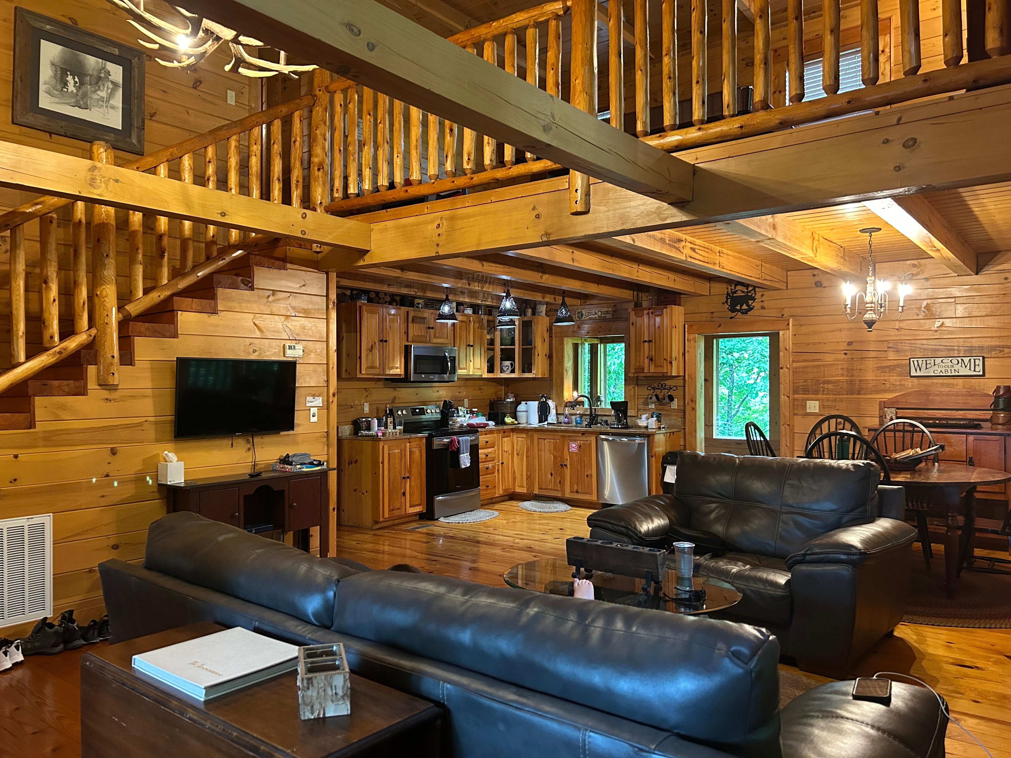 Experience a warm and welcoming winter retreat surrounded by the peaceful beauty of the Smoky Mountains. As you step inside, the soft glow of the fireplace and the inviting living space set the tone for slow mornings, holiday movies, and relaxed evenings together. Enjoy a warm drink on the deck as the winter air settles in, cook your favorite season meals in the fully equipped kitchen, or unwind by the fully decorated christmas tree after exploring nearby winter lights, scenic overlooks, and festive attractions.