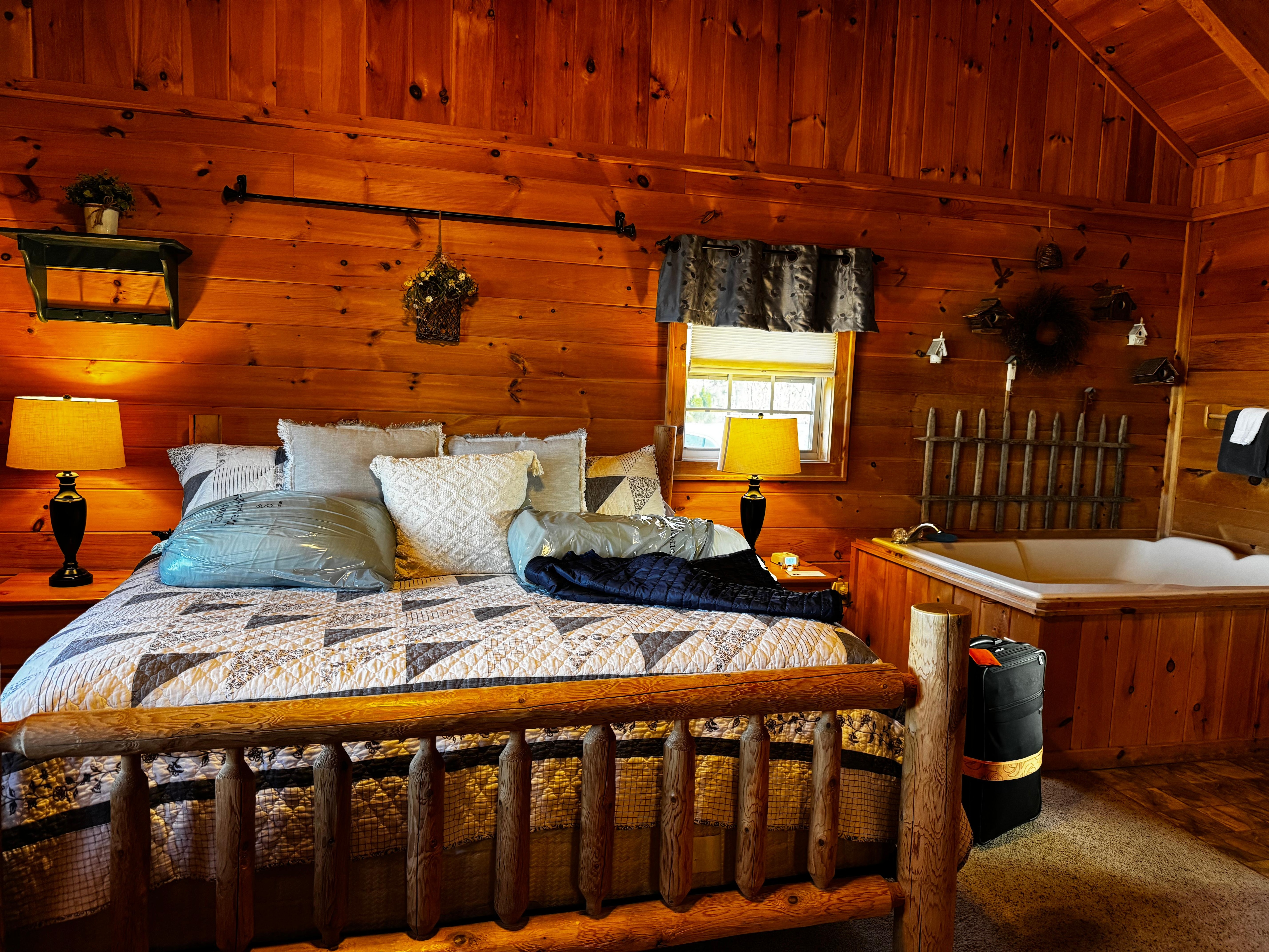 The cabin has a jetted tub indoors as well, in the spacious bedroom. The tub is designed for two, so you can enjoy the massaging jets of steamy water with your sweetie before climbing into the king-size bed. The lustrous wood-planked walls, the vaulted ceiling, and the rustic furnishings definitely add to the romantic ambience. All that’s left is to play your favorite music on the cabin’s CD player.