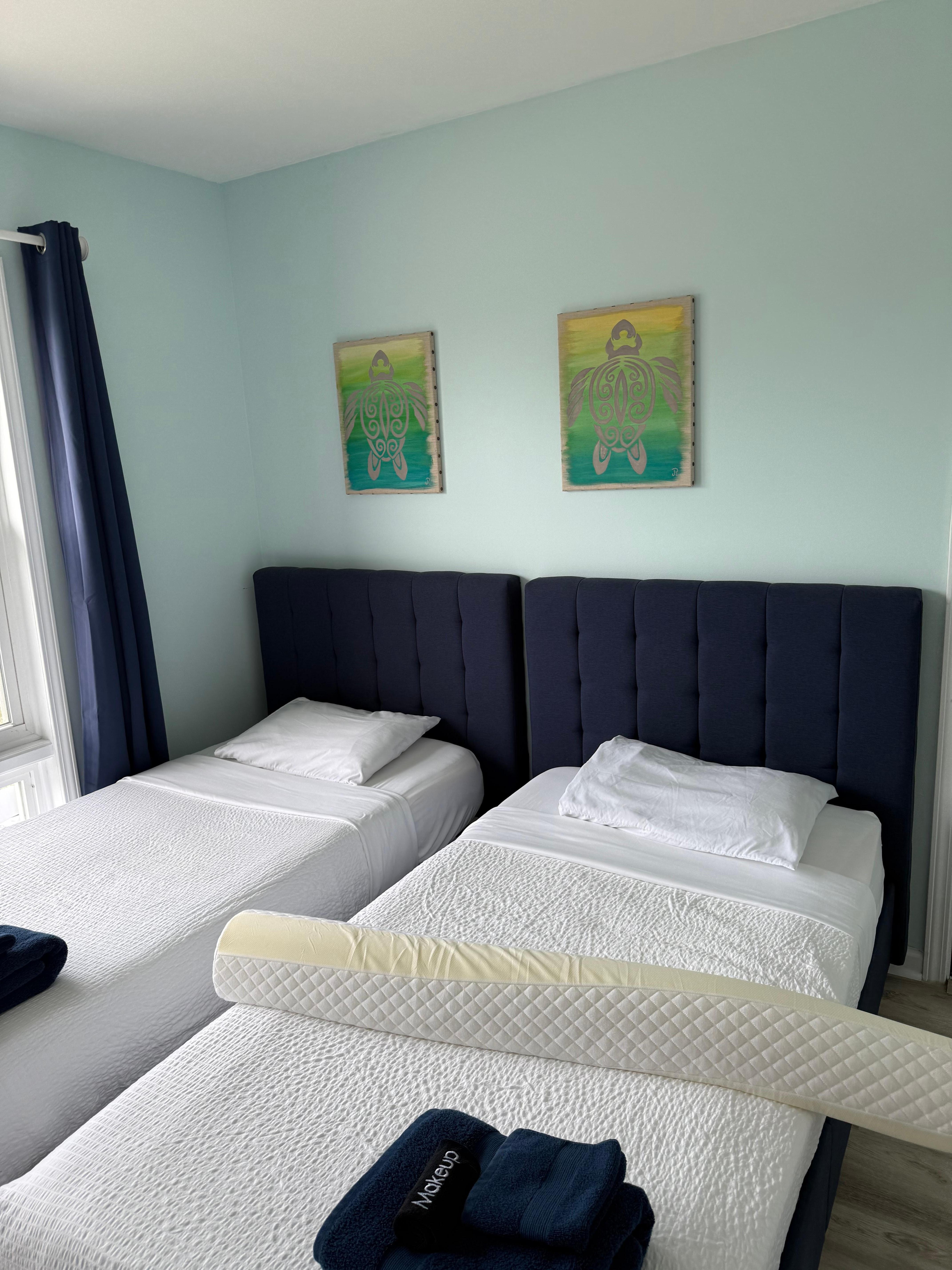 Guest bedroom: Two twin beds with medium-firm foam mattresses and memory foam toppers. Linens included, sheets already on the bed. Closet. Extra blankets included. Full curtains. Partial sound view. Emergency ladder in case of fire.