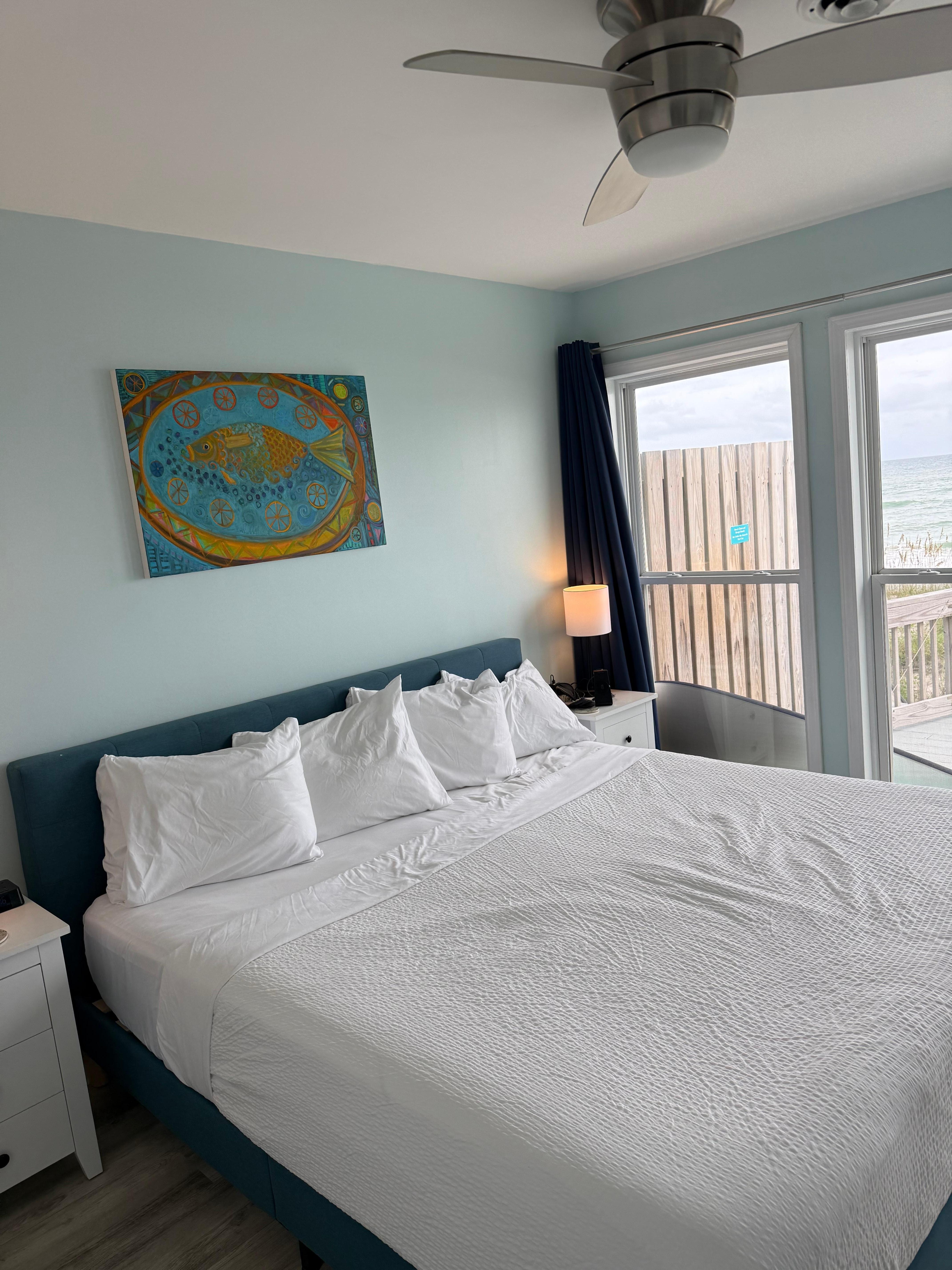 Primary bedroom: king bed with medium-firm foam mattress and memory foam topper, smart TV, closet, storage, extra blanket, linens on bed. Spectacular ocean view. See the sea from bed! Exterior door to deck. Full black-out curtains.