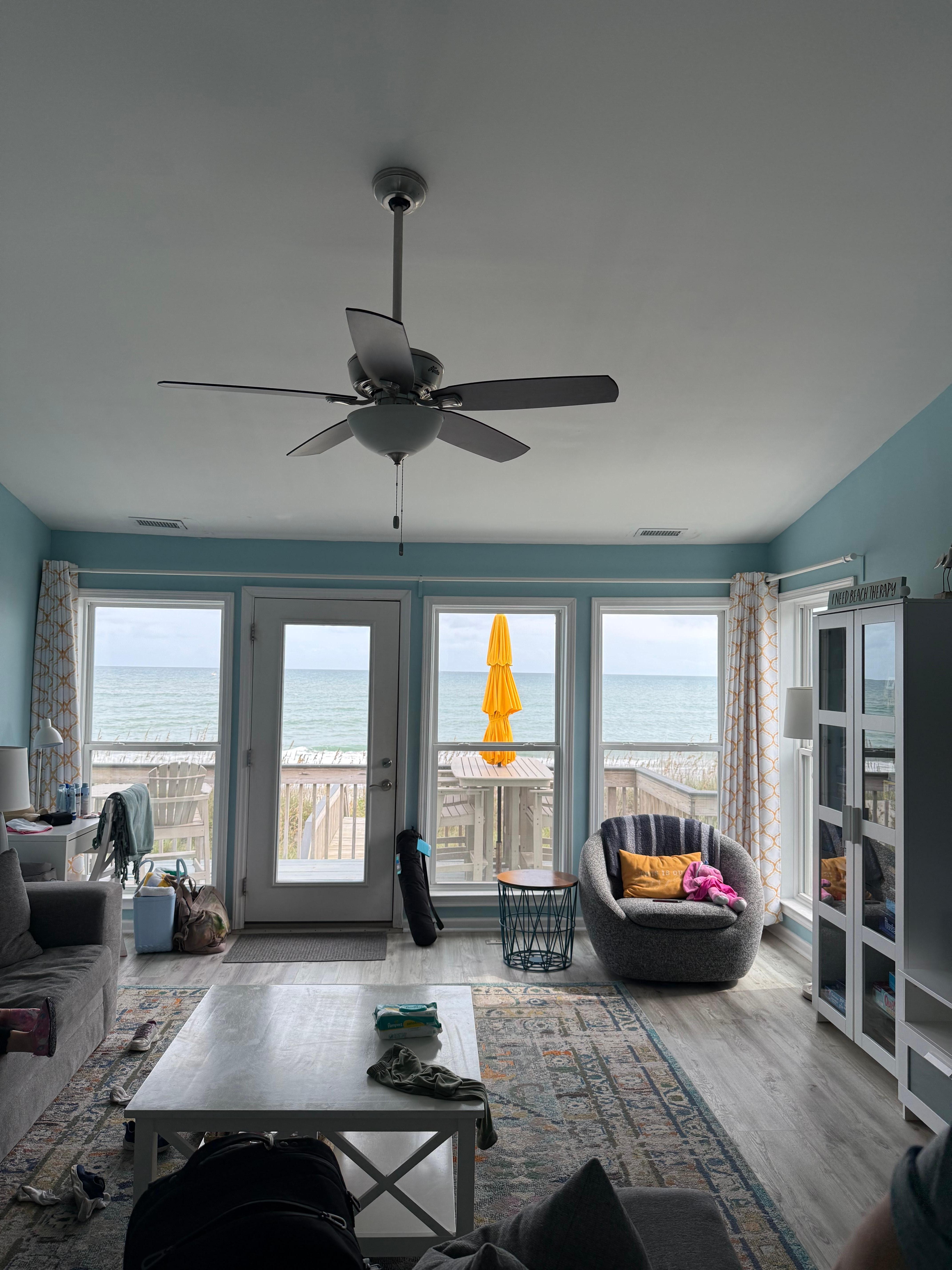 Living room: Large comfortable sofa and loveseat. Open storage for personal items. New in 2020, large 65" Smart TV with Spectrum Cable (access Netflix, Hulu, more with your own accounts). BluRay player included. Games, books, and more for family time. Floor to ceiling windows overlooking beach, over the dunes into the ocean. Best view on the island.