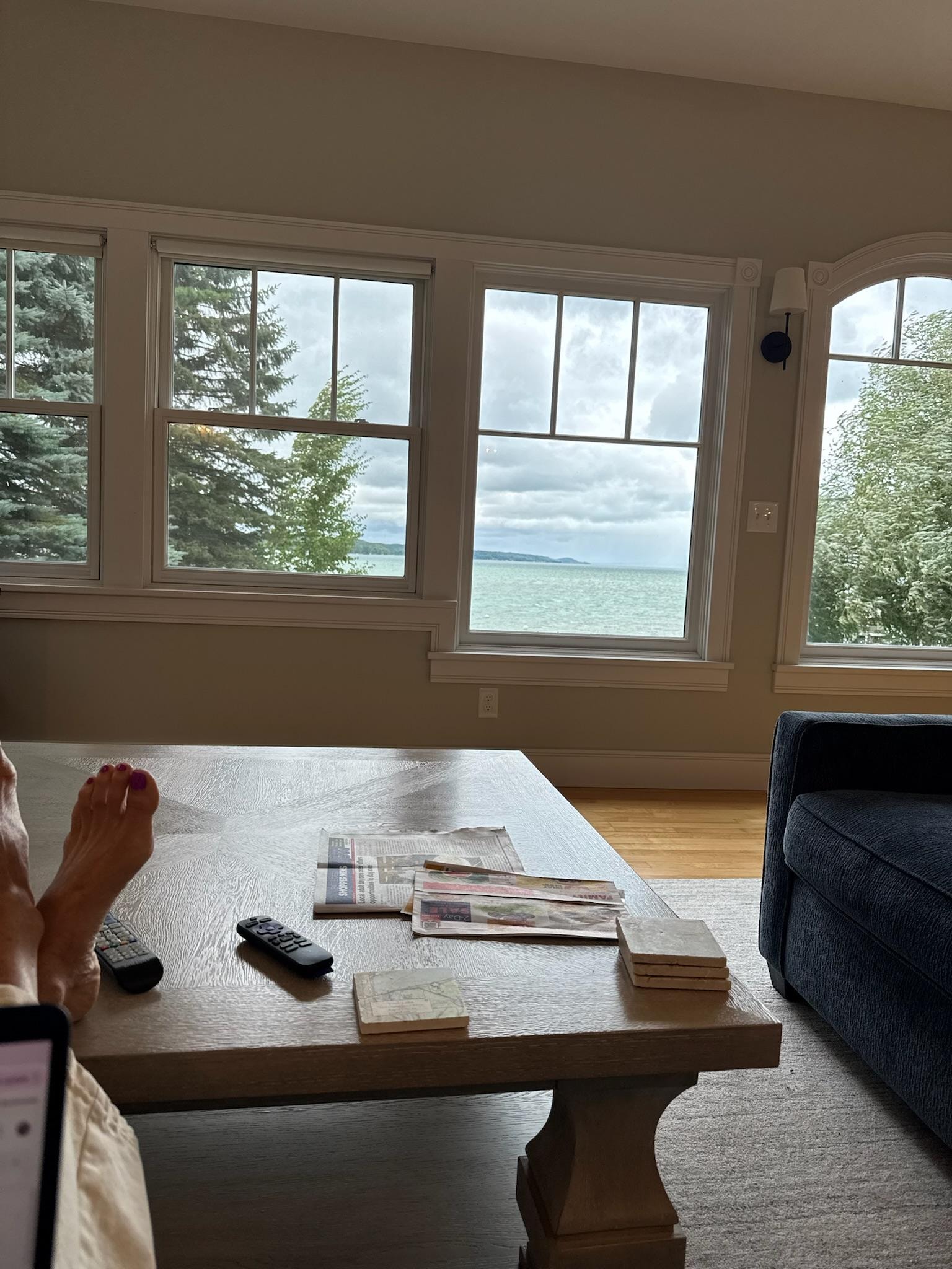 This home has a large basement which has a full bathroom, a sitting area with a large TV and a couch, an area with two bunkbeds (twin over full bunk beds) and finally a lovely view of the lake through windows & French doors. This basement doubles as a 6th bedroom and/or a 3rd gathering space (aka "3rd family room").