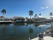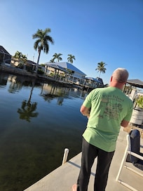 Reel Paradise is a two bedroom two bathroom house on a fenced in large lot located in Matlacha, Florida. The inside is freshly painted, new lighting and flooring plus all new furniture throughout. The house has a screened in front porch and screened in patio. The backyard offers a heated outside shower, jacuzzi, fire pitt, boat lift and boat dock, bbq grill, plus plenty of seating and shade. Wide salt water canal, seconds from the gulf by boat, kayak or canoe.