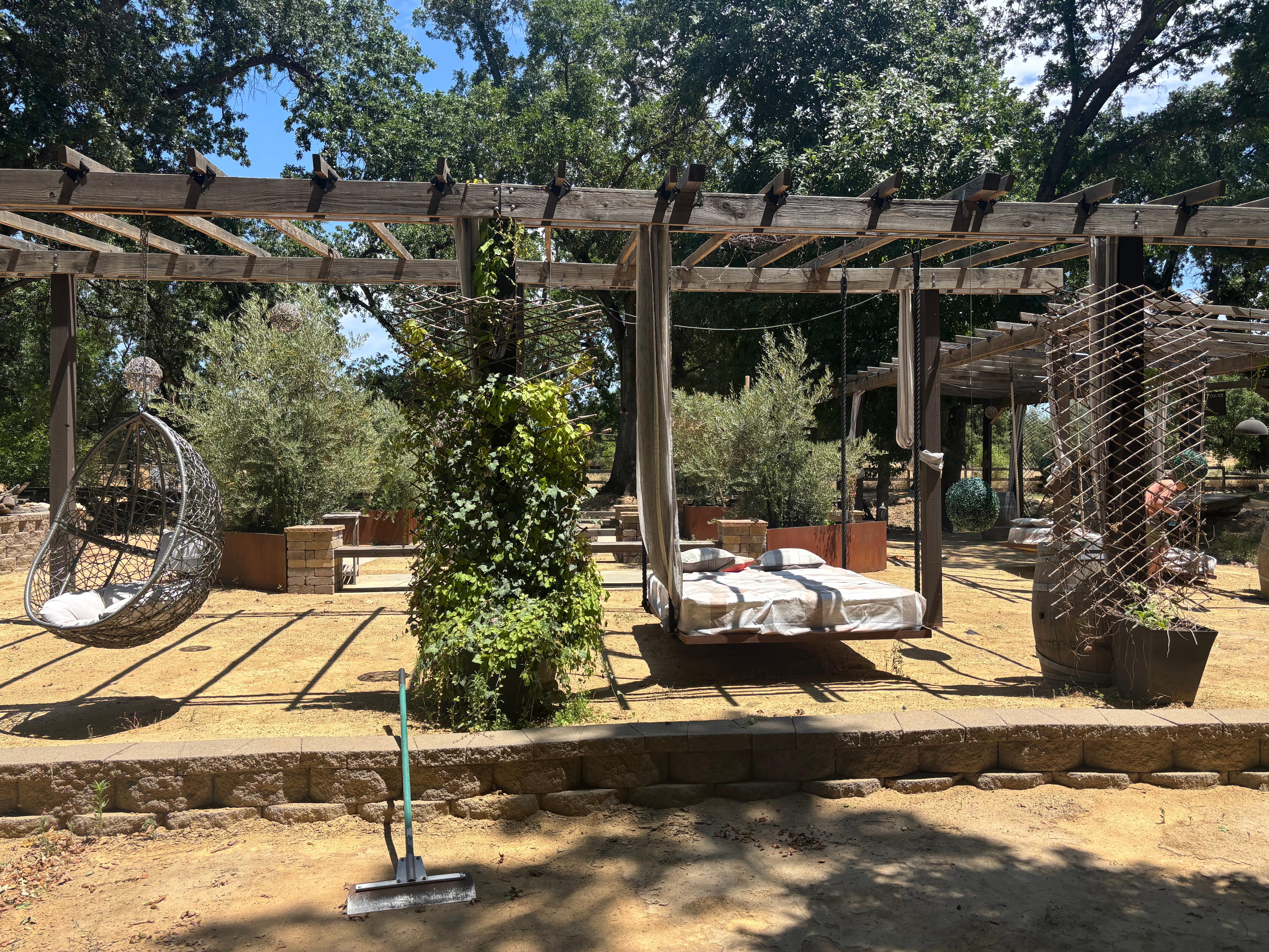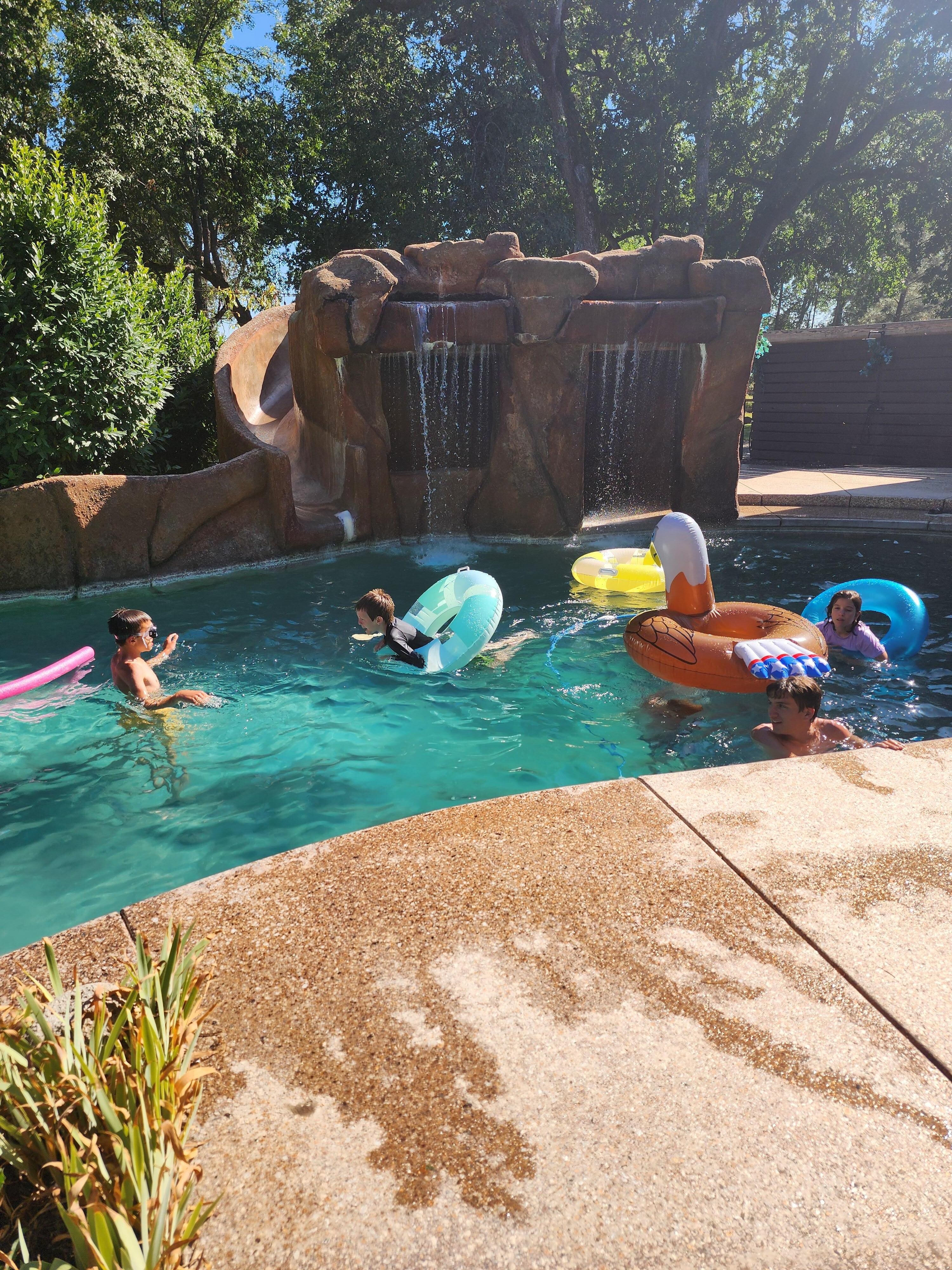 This amazing property sits on 5 acres, just 15 minutes from Redding. Has a full basketball/pickleball court, soccer/football field, fully lit wiffle ball field, bocce ball, horse shoes, archery, walking trail, fire pit area with hanging beds, and an amazing swimming pool with a grotto and waterslide. Sleeps 12 people with 2 Kings, 2 Queens, and 2 bunk bed sets. This is a shared property; the house is a completely separate home.