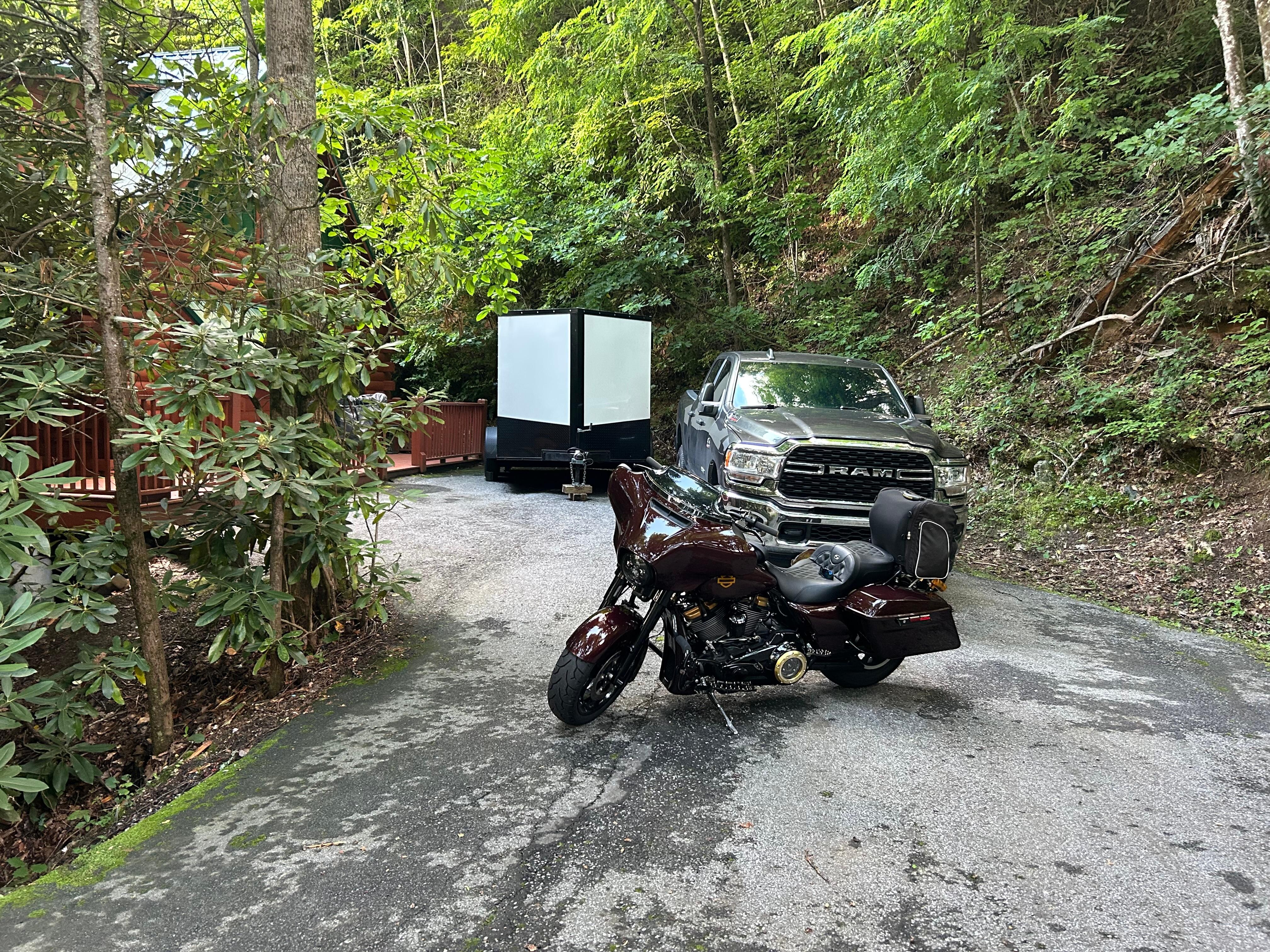 This cabin is located right next to the Maggie Valley golf course greens. The cabin is very easy to get to with no steep/winding roads. You do not need a 4-wheel drive to access the property. There are 2 driveways for parking. The entrance to the first driveway is shared. This one has room for 2 cars or a small trailer. This driveway is located at the rear side of the cabin and has newly installed steps gaining access to the front door. The second or main driveway can fit 2-3 cars. Both driveways are on level ground making it easy for motorcycle parking.
