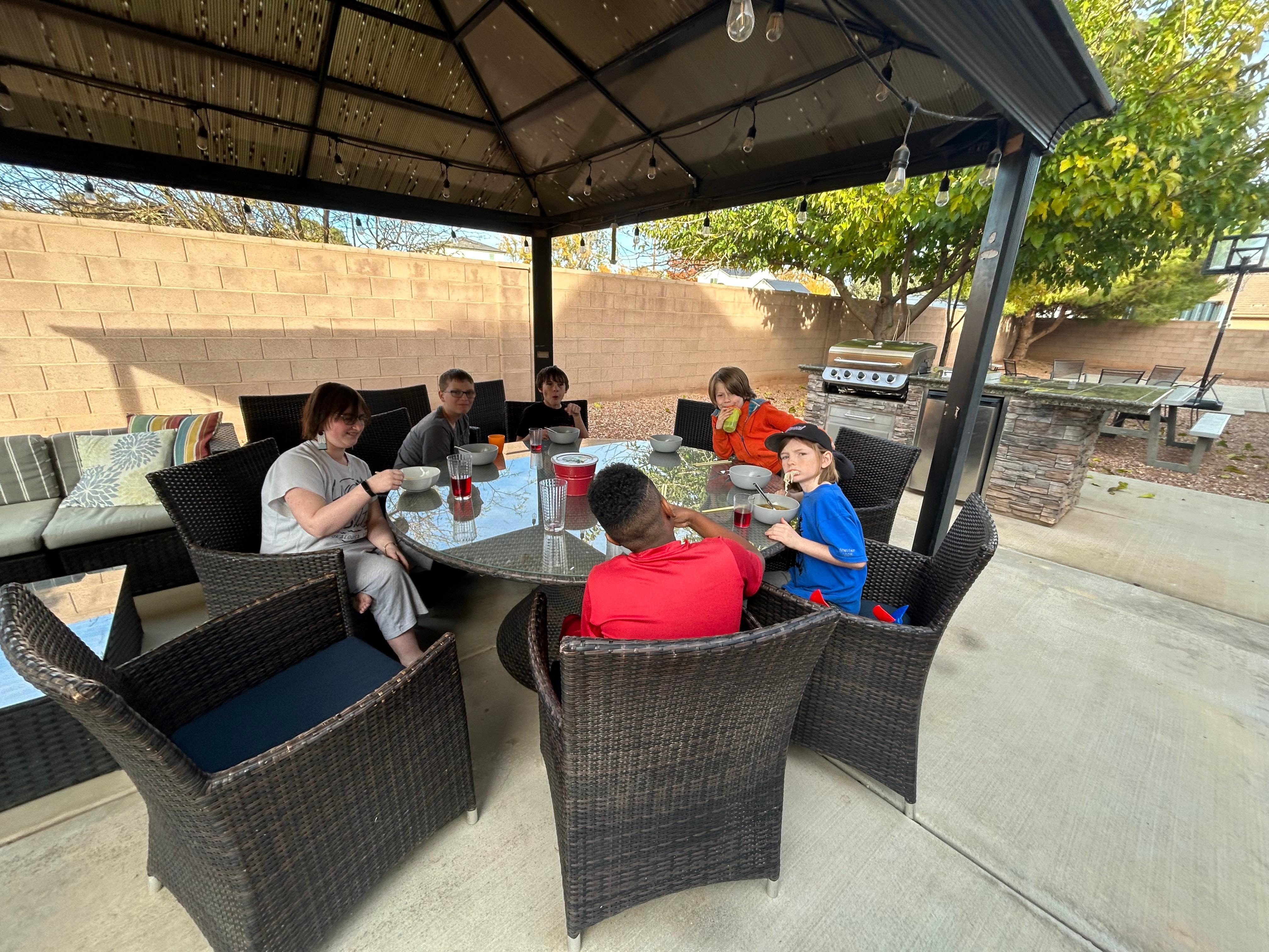The BBQ in the backyard has a countertop area and a small fridge you can plug in if you wish to use it. There is an outdoor sectional sofa and large round table under a cabana in the backyard as well as 12 patio chairs. The BBQ is enclosed in a large unit with countertop space and hosts 4 outdoor barstools. The Jacuzzi and a basketball court area are adjacent to the eating and sitting outdoor areas as well as the gas Fire pit and chairs.