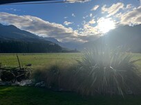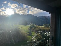 Great wide views up the valley to the mountains from our comfortable, well appointed, rustic accommo