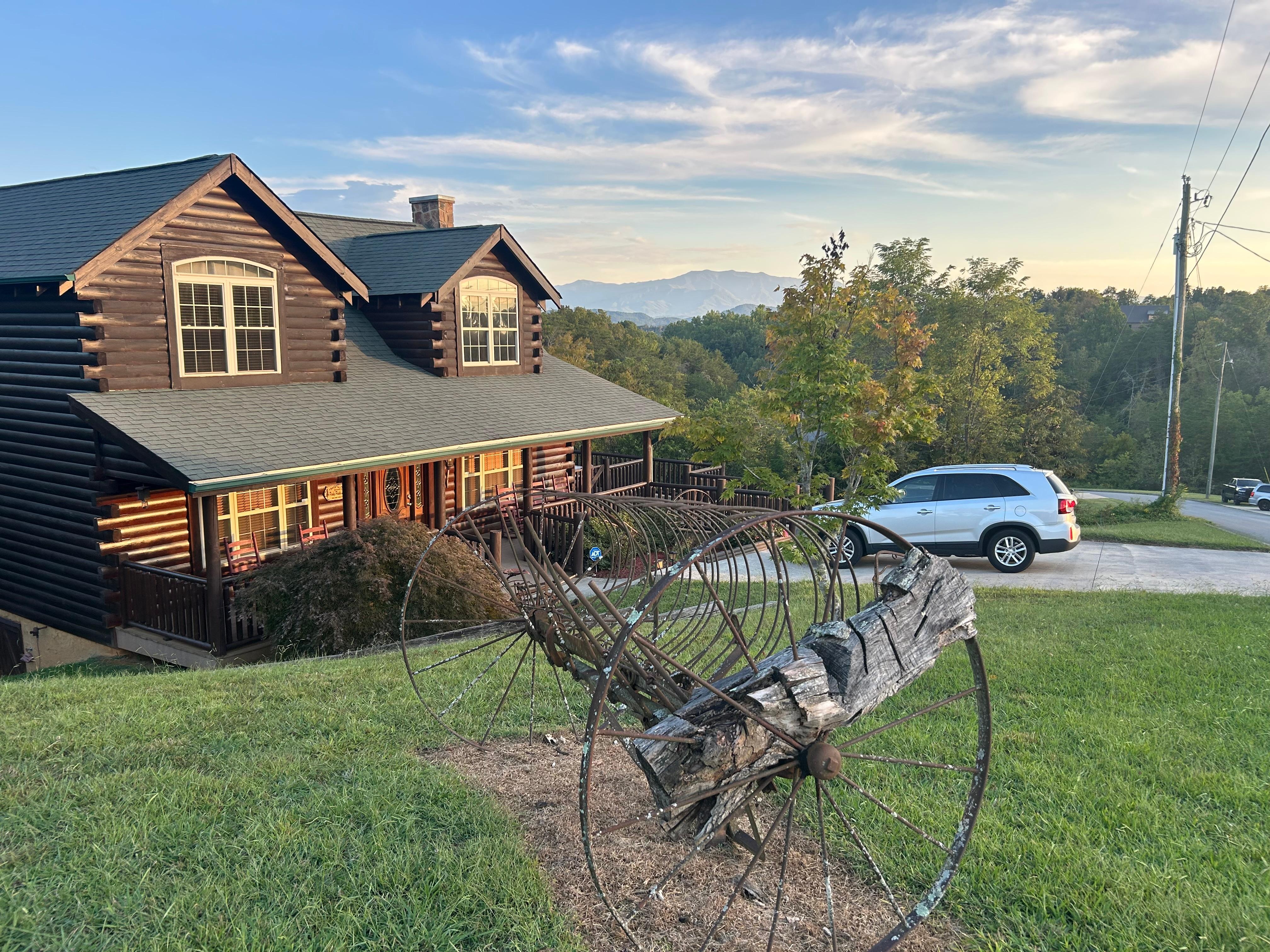 Luxury Mountain View Cabin Rental, unit 778 “Perky Peaks Lodge is the perfect cabin for your next Smoky Mountain Getaway. When you arrive at the cabin, there is a paved ramp that leads you onto the covered front porch. Walking into the cabin you are greeted with intricate woodwork throughout the cabin. When you enter the living room you will see that it was designed for comfort. You can sit back and relax while watching your favorite show on the 70-inch TV, all while relaxing in either the leather loveseat that has 2 recliners, or the leather sofa that has 2 recliners. You can also take in the cabin décor and enjoy the tree over the living room area that has wood animal carvings throughout. When it’s time to eat, enjoy the fully furnished kitchen that has stainless steel appliances, granite countertops, and bar top seating for 6. There is a half bath located just off the open floor plan living room and kitchen. The main level bedroom features luxury handcrafted log furniture, king size bed, and a flat screen television. The on-suite master bathroom has a walk-in shower. Venture outside to the screened in back porch, great for your morning coffee, while sitting at the dinette enjoying the great views of the mountains. When you are ready to relax from all the attractions of the day like, Douglas Lake for fishing/boating, you can sit back and soak your worries away in the hot tub. During the day feel free to relax in the luxury outdoor double gliding rocker while watching the family play a game of corn hole. There is a gas grill for your grilling needs. The upstairs loft features a theater system 70-inch flat screen television with surround sound, queen size sleeper sofa, 60-1 arcade game system, 4-person puzzle/game/card table, and views of the mountains. There is an upper-level covered porch that features a double swing set, great for enjoying a cocktail. The upper-level master suite features luxury hand crafted log furniture, intricate wood carvings in the lofted alcove, and an on-suite master bathroom great for relaxing. Take advantage of the on-suite indoor whirlpool bathtub and walk in shower. If you are looking for a cabin that is great for a luxury getaway, then pamper yourself and enjoy Perky Peaks Lodge. Wireless Internet, Outdoor surveillance device for security purposes only. 2 car parking. No Smoking. No Pets Please. Sleeps 6.