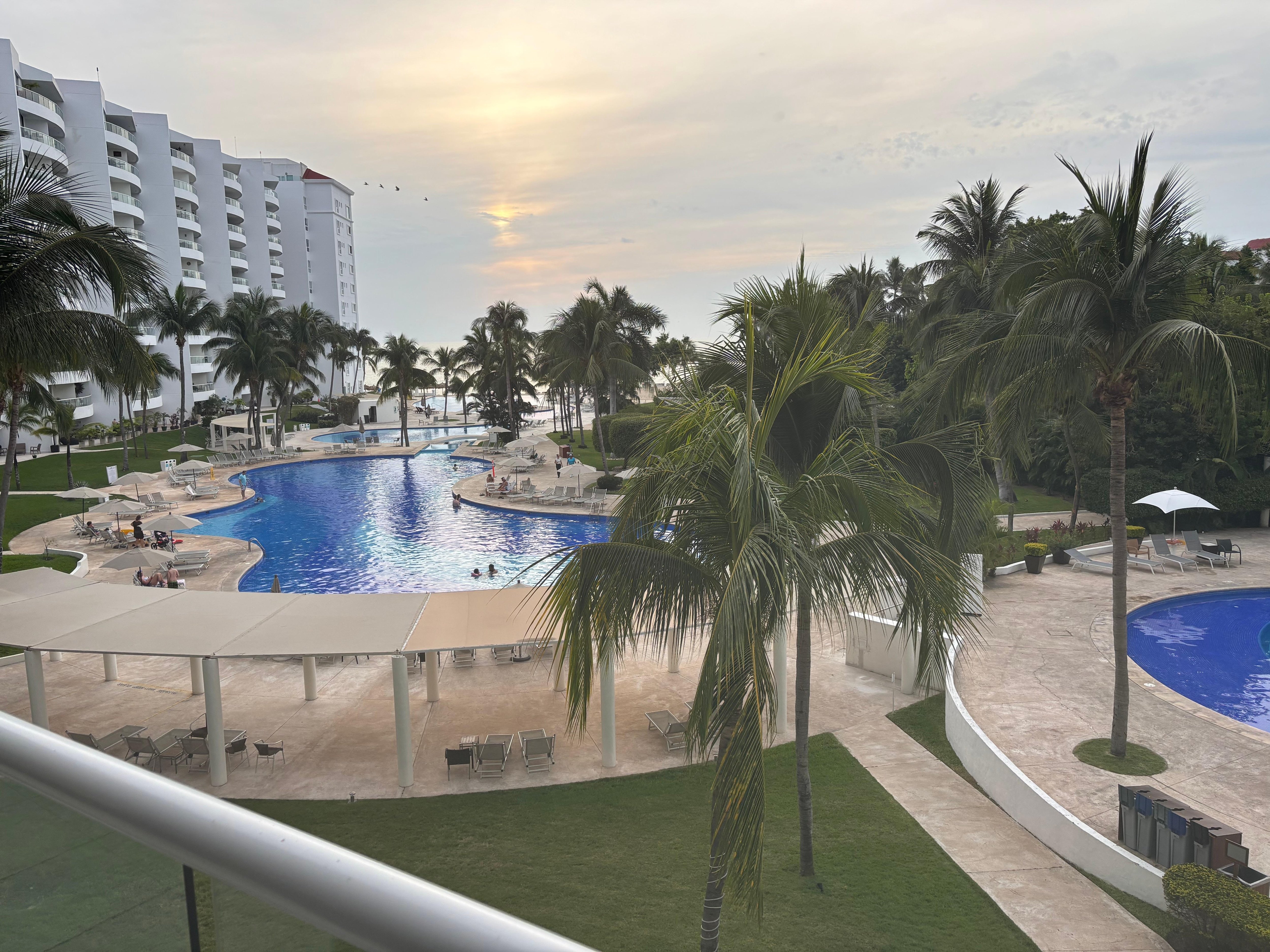 We enjoyed our 3 week stay at this condo but we had no idea that this property shares pools and all beach front palapas with the hotel next door. There is a battle every day for pool chairs as well as beach chairs. If you aren’t up and down by 6:00am you will probably not get palapa on the beach. There are signs that say unoccupied chairs with towels, etc will be removed. In our 22 days, this happened once and this allowed us a beach chair. Also, the hotel has outdoor music and shows at night and it definitely is loud. This condo is close to the hotel and if you want to go to bed early, forget it. There were several nights that hotel guests hanging out having a great time !