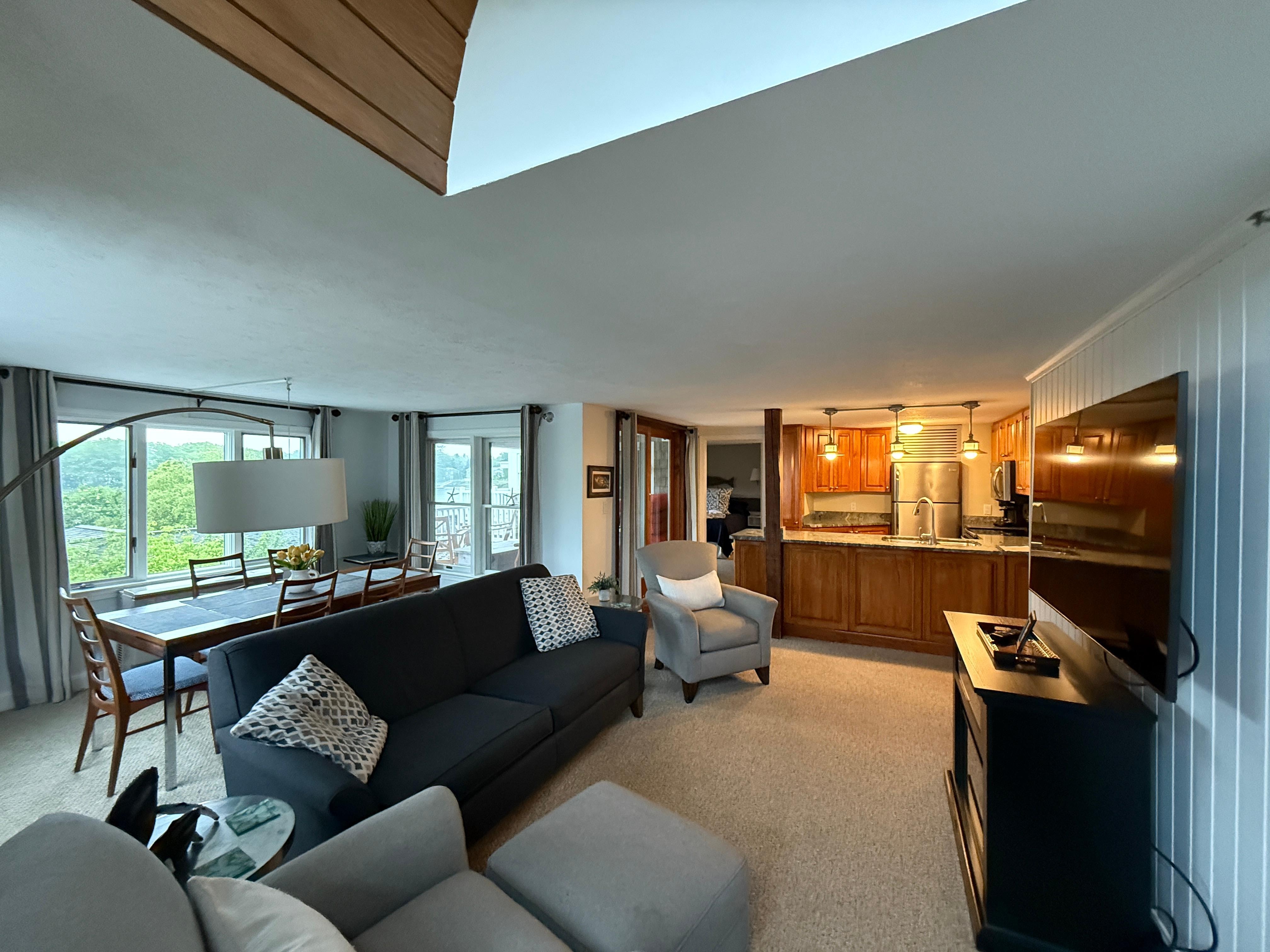 This is a charming newly renovated waterfront second floor condo that's walking distance to the shops and restaurants located in Dock Square, Kennebunkport. It is one mile from the Kennebunk beaches. Offering a cheery, bright open floor plan with lots of windows including living room, dining area with river view, and beautiful kitchen with new granite counter tops. The owners spared no expense renovating the whole place along with purchasing new living room furniture which adds to the comfort of this condo. The Condo sleeps 4. The spacious master suite with King bed and complete newly renovated master bathroom with full size walk in glass shower. There is a second bedroom with twin beds which can be converted to King Bed on request with an adjacent updated full bath and laundry area. The private deck overlooks the Kennebunk River as well as the English gardens where you can relax and have morning coffee or afternoon cocktails. Use our private dock for your kayak, paddle board or enjoy fishing. An outside table and chairs near the dock with use of a Gas Grill. This Condo is a great place to spend a week in the summer or year round a minimum of three nights.