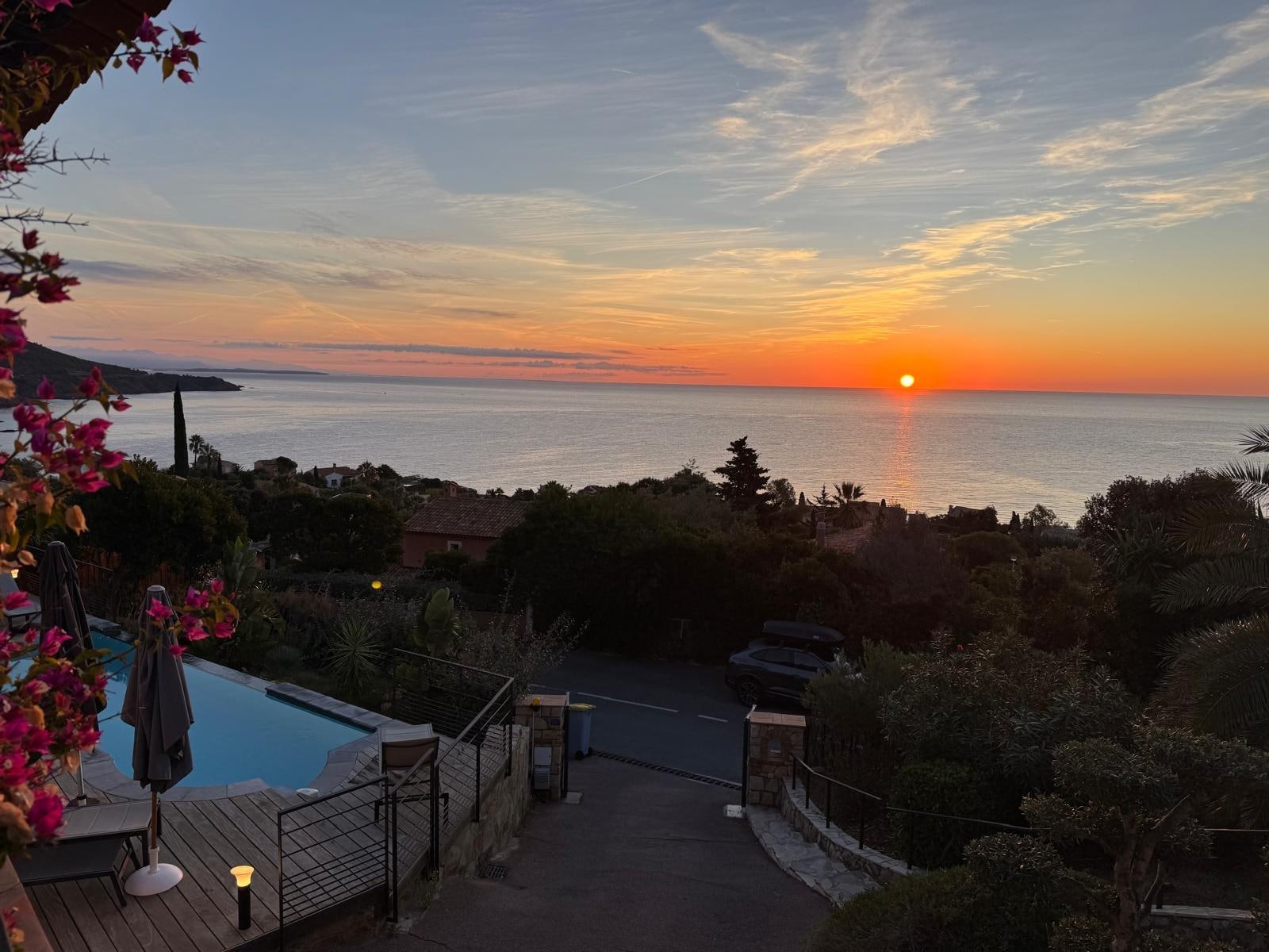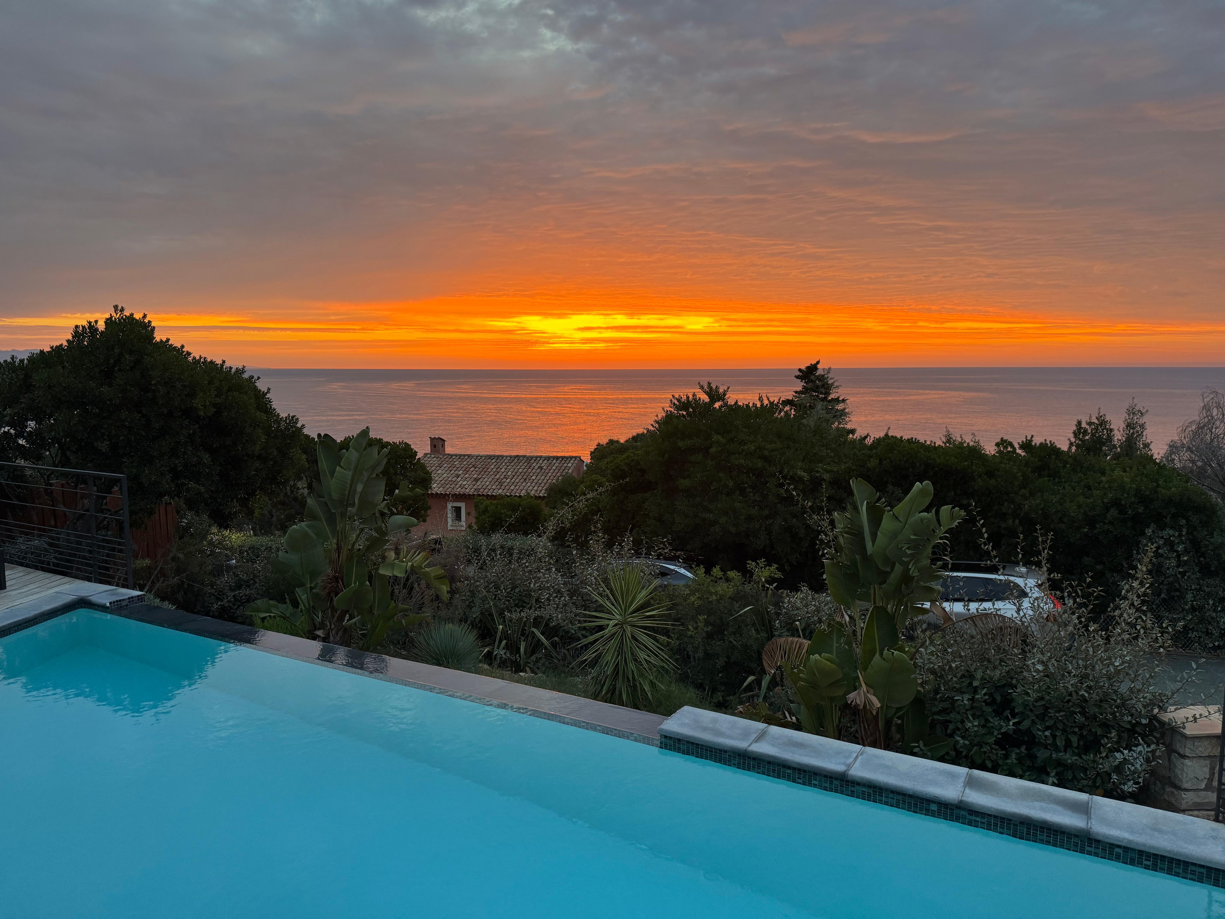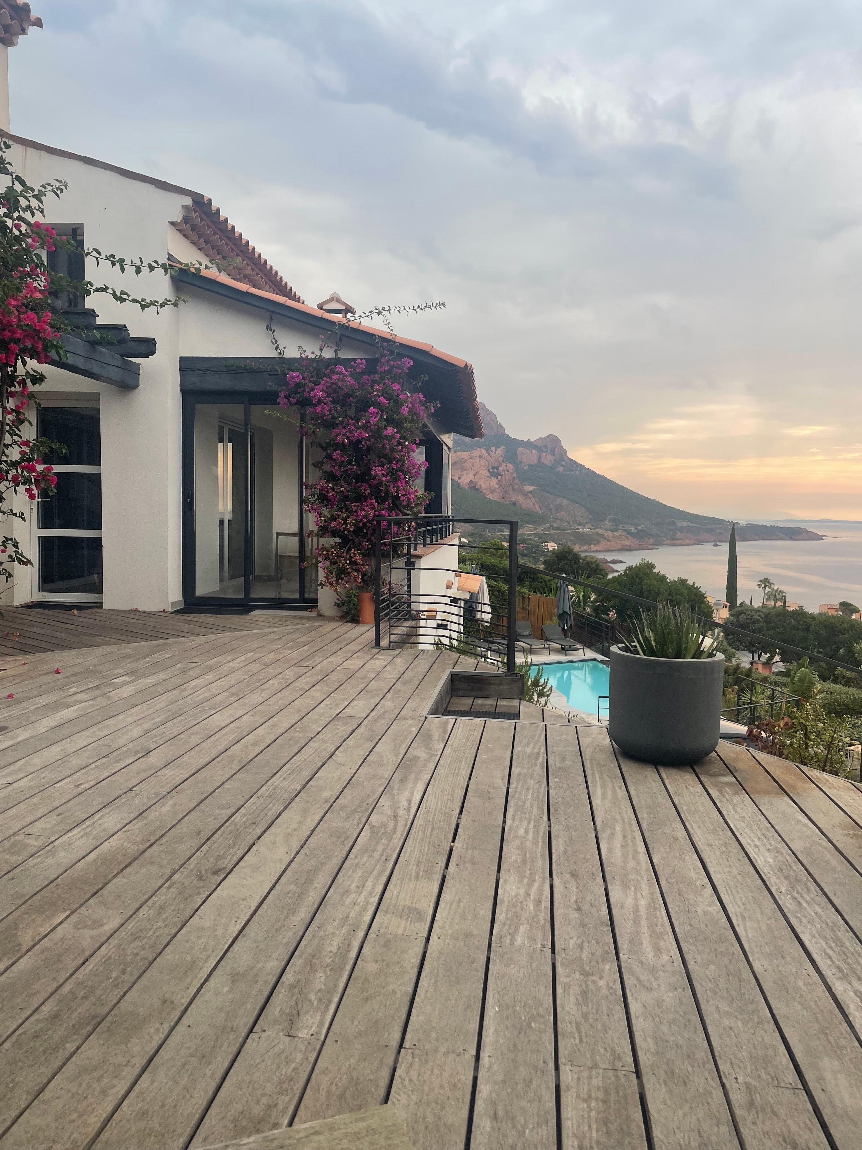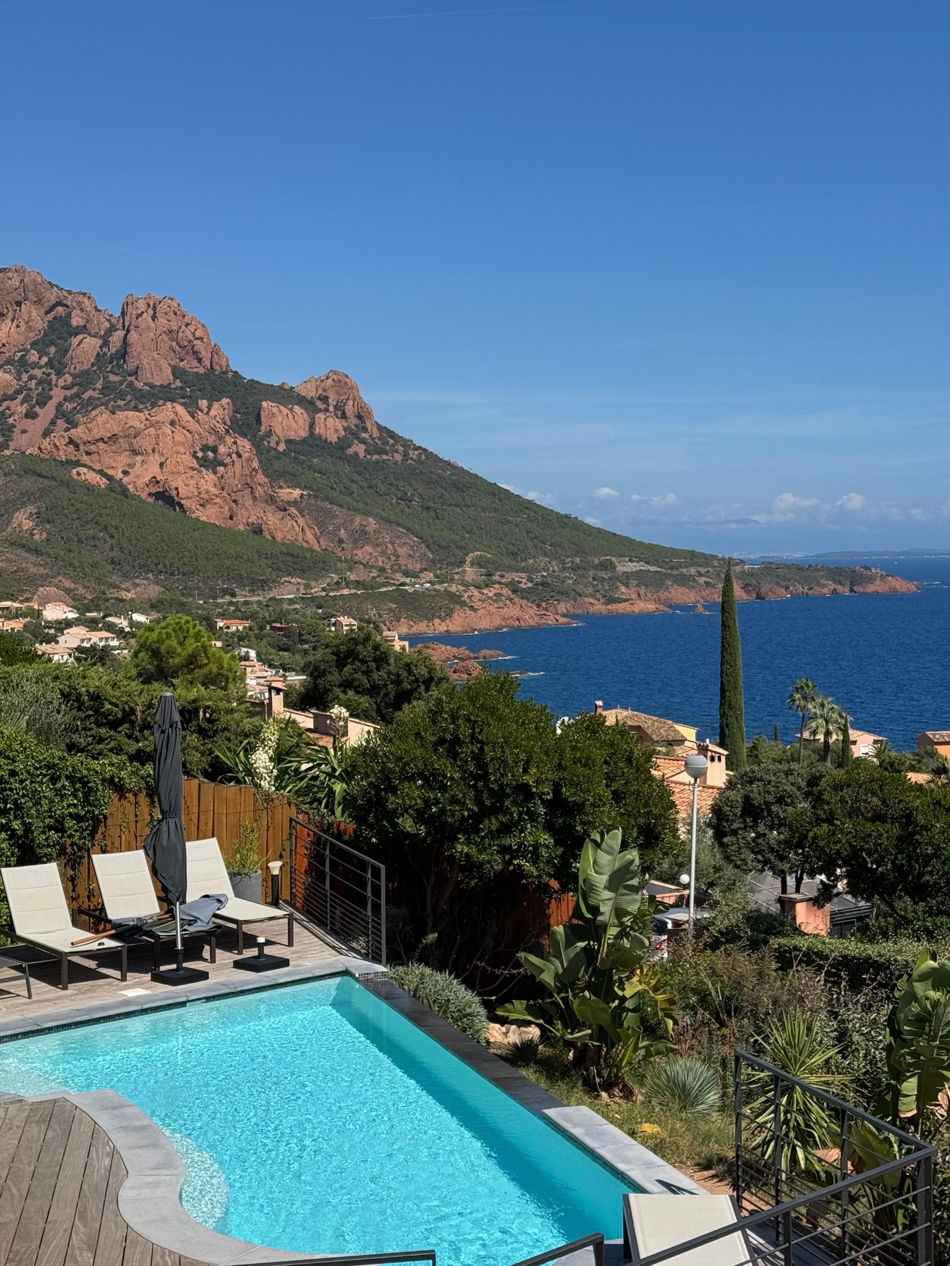 Magnificent features for this new villa facing the sea, in the private and secure Anthéor estate. It sleeps up to 10 people in comfort, with stunning sea views, air conditioning in every room and a heated swimming pool. Built on 3 levels, it comprises a lovely, bright living room, a fully-equipped kitchen with a large dining area, a double bedroom with a 140x200 bed, a bathroom (with shower and bath) and a separate toilet. In front of the house is a large covered terrace, enclosed by sliding glass doors, where you can enjoy the splendid view of the sea and the Esterel massif in all seasons.